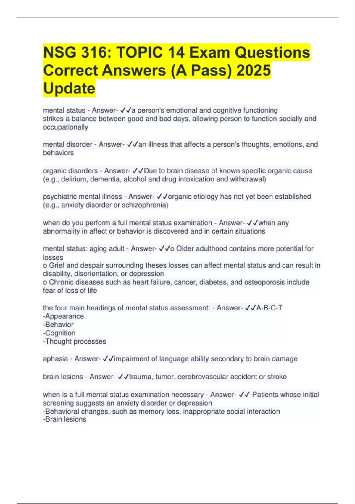 mental status: aging adult - Answer- ✔✔o Older adulthood contains more potential for