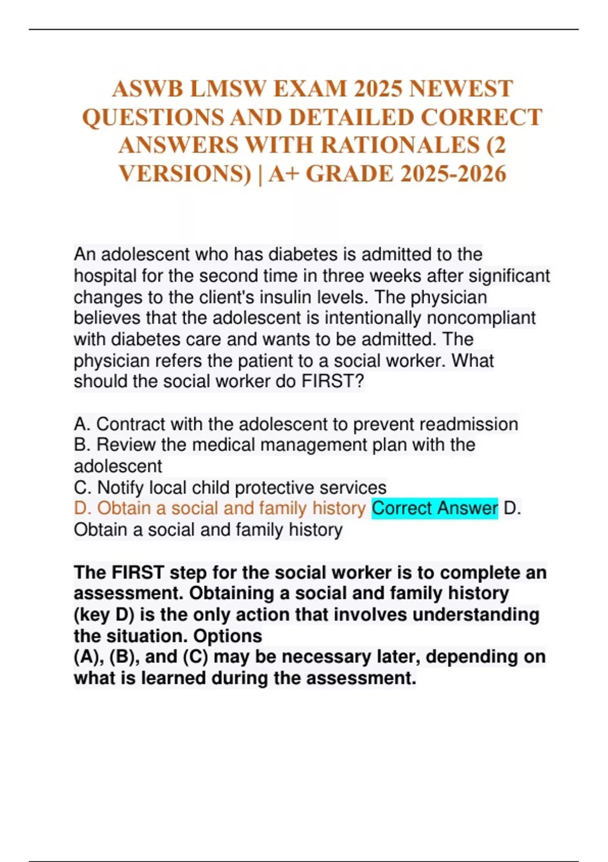 ASWB LMSW EXAM 2025 NEWEST QUESTIONS AND DETAILED CORRECT ANSWERS WITH RATIONALES (2 VERSIONS) | A+ GRADE