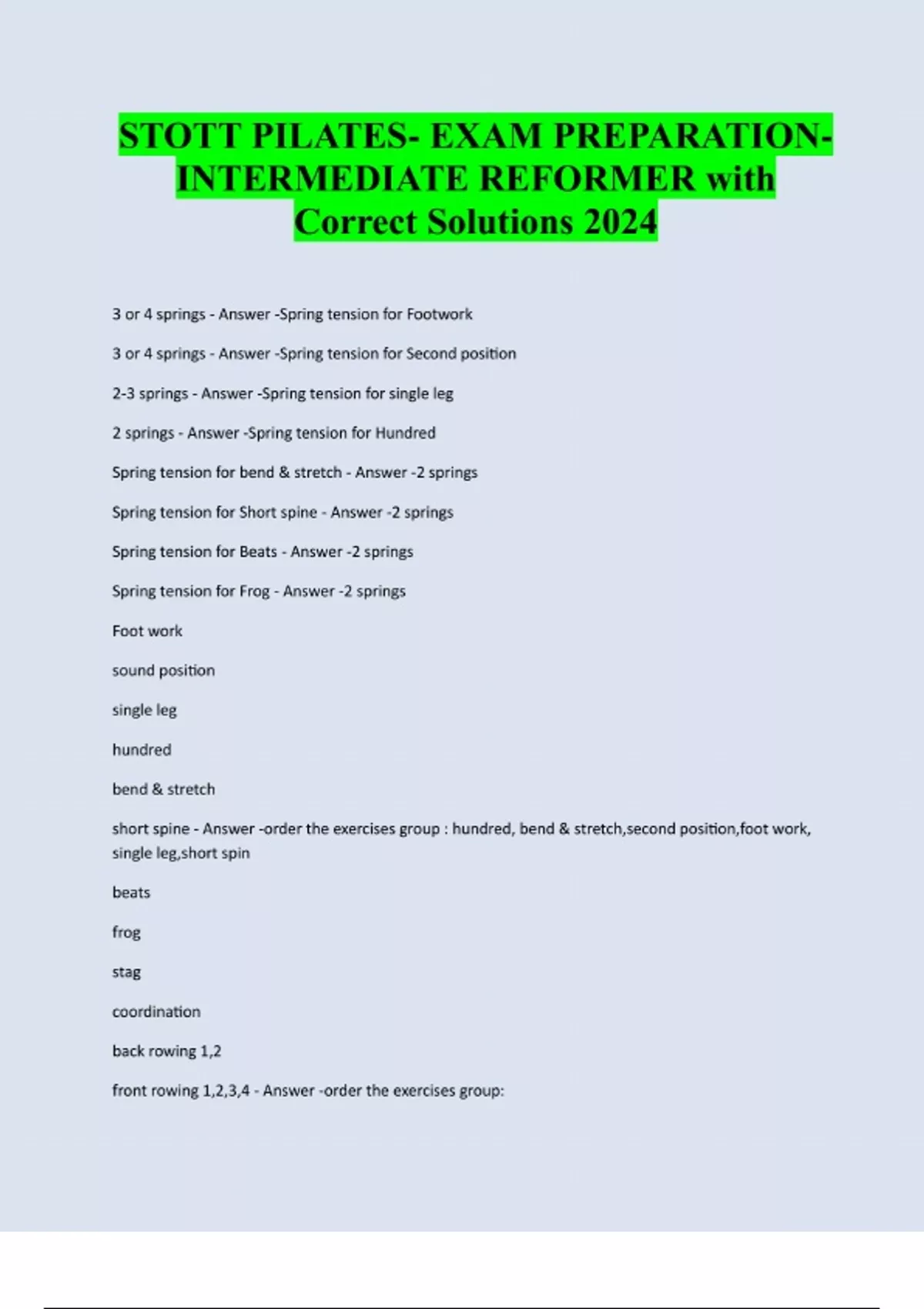 STOTT PILATES- EXAM PREPARATIONINTERMEDIATE REFORMER with Correct Solutions 2024 3 or 4 springs - Answer -Spring tension for Footwork 3 or 4 springs - Answer -Spring tension for Second position 2-3 springs - Answer -Spring tension for single leg 2 springs - Answer -Spring tension for Hundred Spring tension for bend & stretch - Answer -2 springs Spring tension for Short spine - Answer -2 springs Spring tension for Beats - Answer -2 springs Spring tension for Frog - Answer -2 springs Foot work sound position single leg hundred bend & stretch short spine - Answer -order the exercises group : hundred, bend & stretch,second position,foot work, single leg,short spin beats frog stag coordination back rowing 1,2 front rowing 1,2,3,4 - Answer -order the exercises group:stag front rowing 1,2,3,4 coordination beats frog back rowing 1,2 Stomach massage Arms pulling strap- long box 1,2,3 Back stroke prep long box Feet puling straps - short box 1,2,3,4 Round back - short box Straight back - short box Twist with round - short box Lean- short box Tree- short box Mermaid - short box 1,2,3 - Answer -order the exercises group: Mermaid - short box 1,2,3 Twist with round - short box Feet puling straps - short box 1,2,3,4 Stomach massage Back stroke prep long box