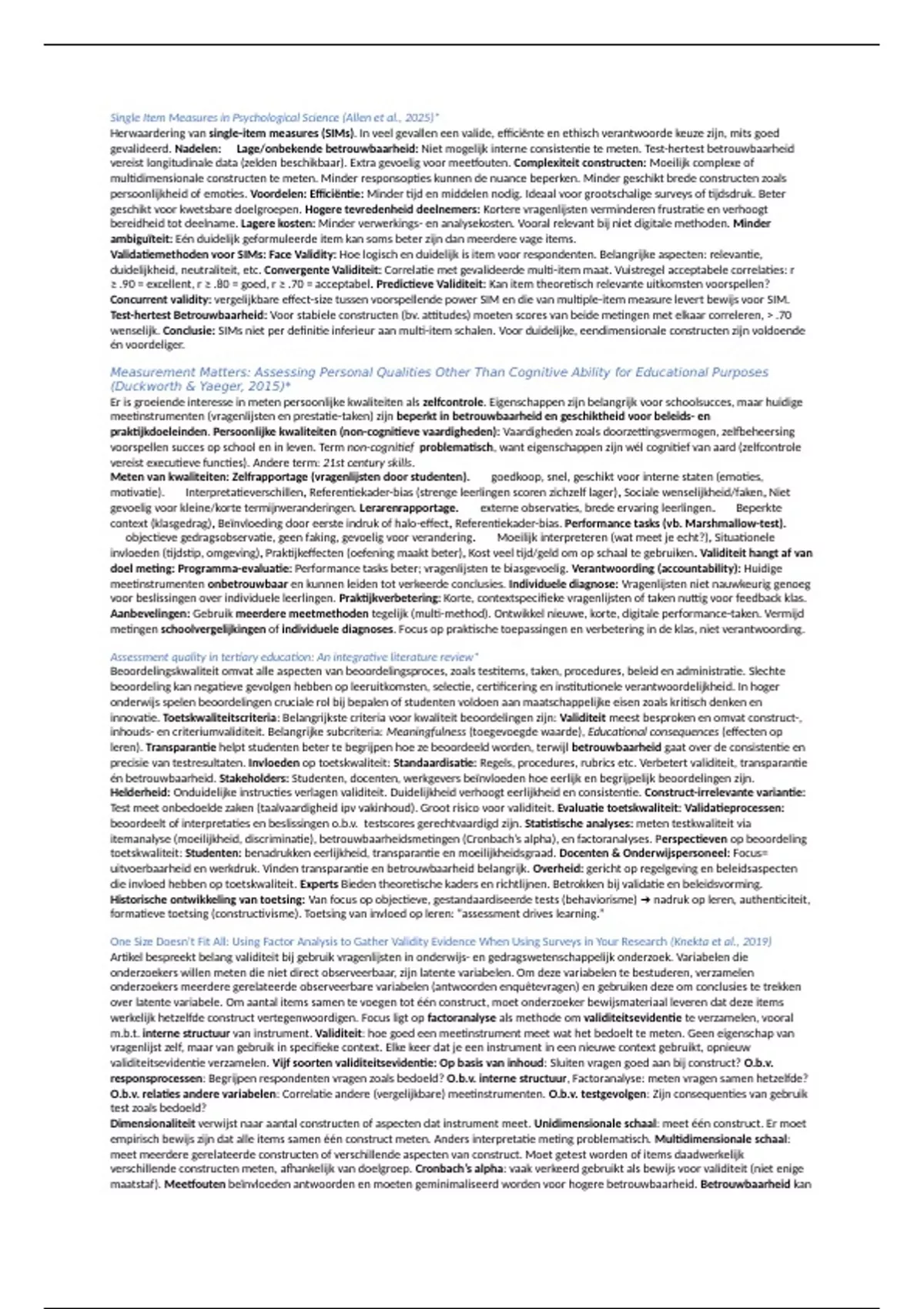 verschillende constructen meten, afhankelijk van doelgroep. Cronbach’s alpha: vaak verkeerd gebruikt als bewijs voor validiteit (niet enige
