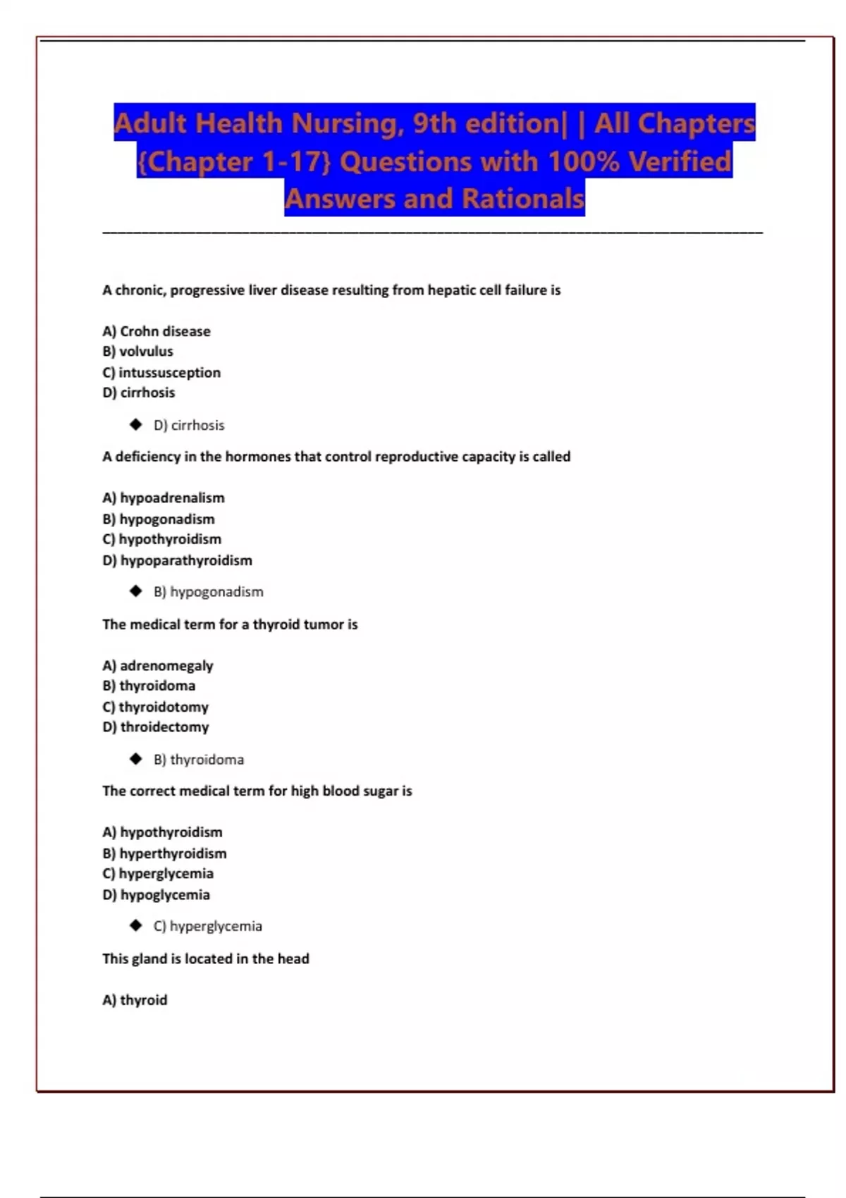 Adult Health Nursing, 9th edition| | All Chapters {Chapter 1-17} Questions with 100% Verified Answers and Rationals