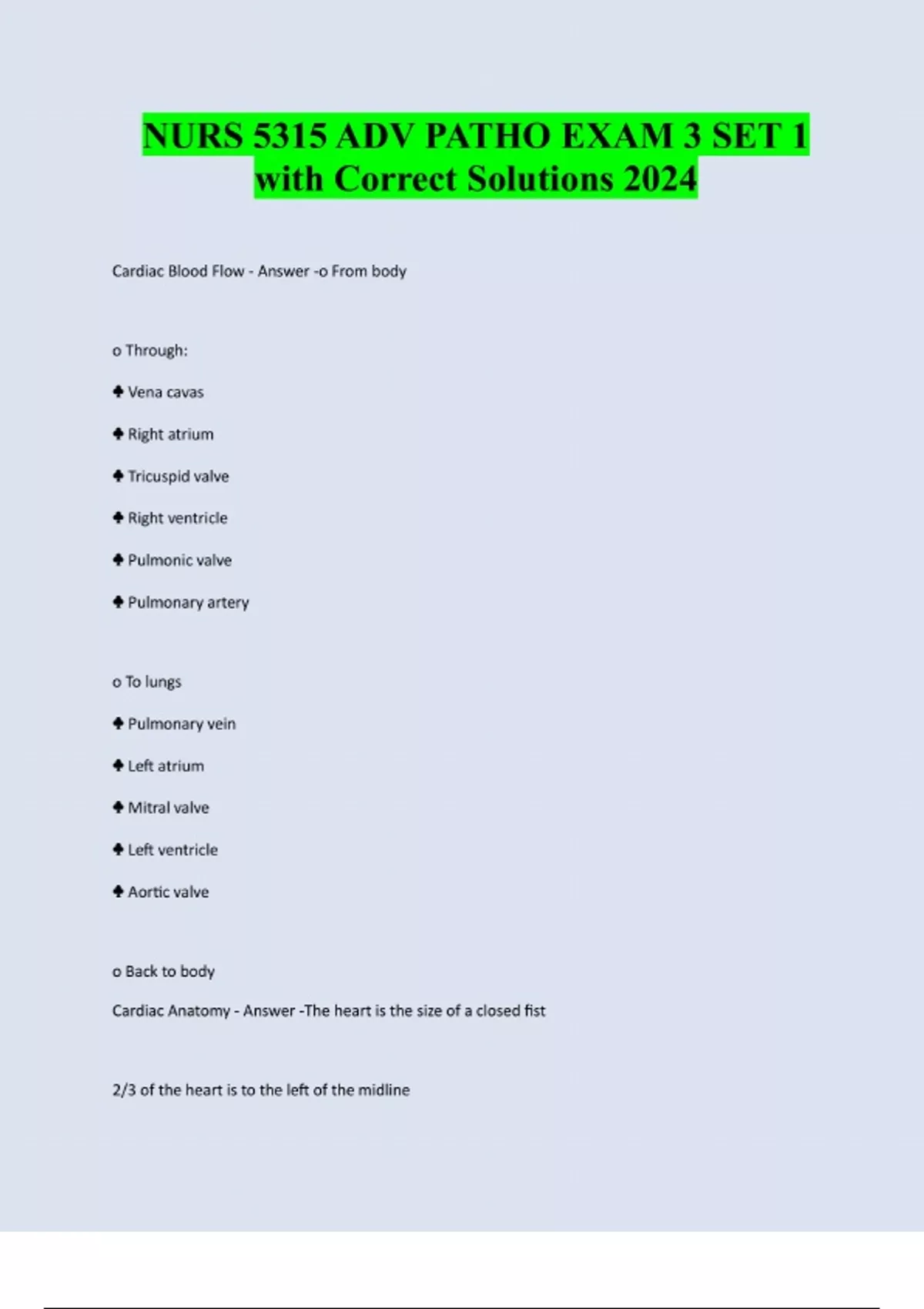 NURS 5315 ADV PATHO EXAM 3 SET 1 with Correct Solutions 2024 Cardiac Blood Flow - Answer -o From body o Through: Vena cavas Right atrium Tricuspid valve Right ventricle Pulmonic valve Pulmonary artery o To lungs Pulmonary vein Left atrium Mitral valve Left ventricle Aortic valve o Back to body Cardiac Anatomy - Answer -The heart is the size of a closed fist 2/3 of the heart is to the left of the midline1/3 under the sternum heart layers - Answer -Endocardium ( inner) myocardium ( middle) Pericardium ( outer) Cardiac action potential: phase 0 - Answer -rapid depolarization Sodium influx d/t voltage-gated sodium channels opening Cardiac action potential: phase 1 - Answer -initial repolarization of cells voltage gated sodium channels closed voltage gated potassium channels open Potassium leaves cell slowly Cardiac action potential: phase 2 - Answer -plateau phase voltage gated calcium channels open influx of calcium into the cell balances potassium efflux calcium influx triggers more calcium from sarcoplasmic reticulum > myocardial contraction Cardiac action potential: phase 3 - Answer -Rapid Repolarization w/ potassium efflux voltage gated potassium channels open voltage gated calcium channels close Cardiac action potential: phase 4 - Answer -resting membrane potential, -85 mV High potassium permeability from the potassium channels Potassium imbalance affect on myocardial action potentials - Answer -Hypokalemia-increased atrial preload leads to 1-3 degree blocks Hyperkalemia-slows depolarization, leads to sunus bradycardia and junctional rhythm Calcium imbalance affect on myocardial action potentials - Answer -Hypocalcemia-decreased contractility Hypercalcemia-increased contractility>ST and PJCs, vasoconstrictionMagnesium imbalance effect on the Cardiovascular system - Answer -Magnesium causes vasodilation Cardiac Output (CO) - Answer -Amount of blood pumped in 1 minute (~5 L) HR x Stroke volume Stroke Volume (SV) - Answer -measurement of the amount of blood ejected from a ventricle in one contraction depends on preload, endogenous inotropic agents, negative inotropic agents, myocardial oxygenation Ejection Fraction (EF) - Answer -percentage of blood volume in the ventricles at the end of diastole that is ejected during systole; a measurement of contractility Stroke volume/end diastolic volume Normal = 55-65% EF decreases w/ systolic heart failure but no change with diastolic heart failure Cardiac Cycle: Diastole - Answer -Ventricles relaxed Blood entering