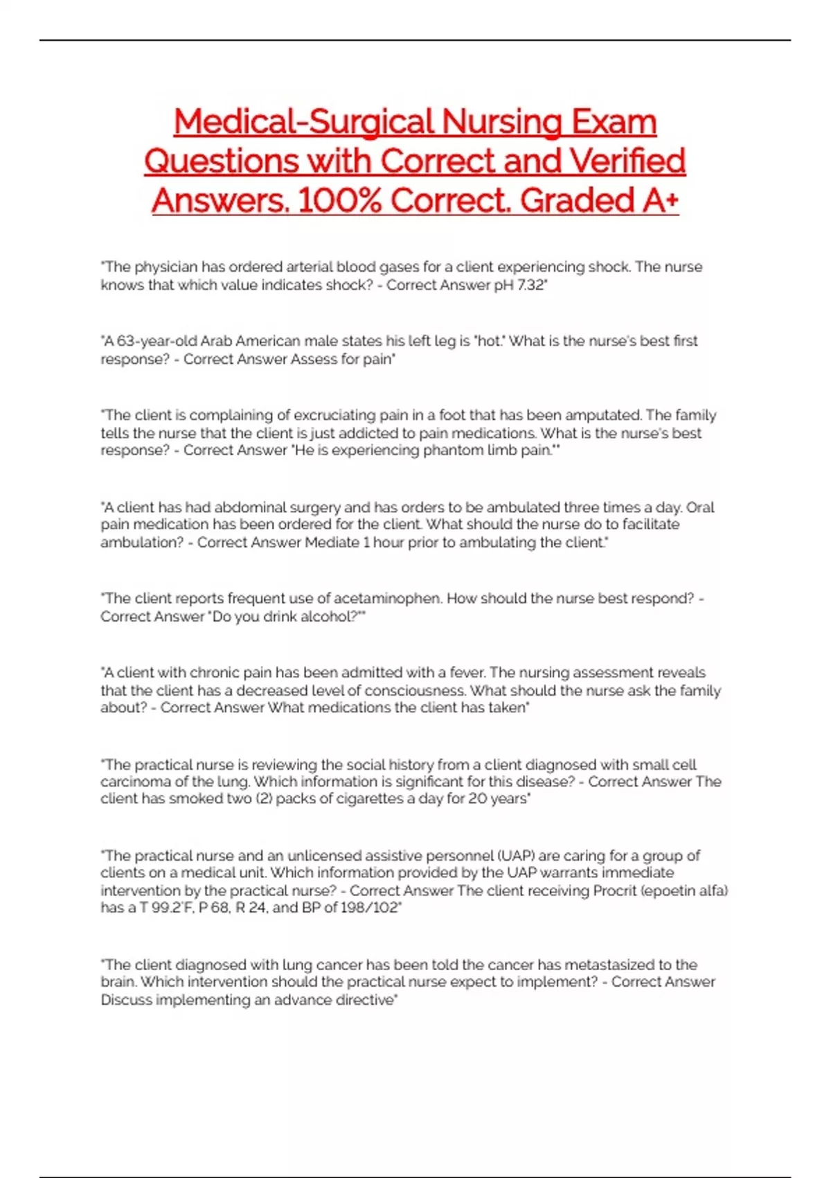 Medical-Surgical Nursing Exam Questions with Correct and Verified Answers. 100% Correct. Graded A+ "The physician has ordered arterial blood gases for a client experiencing shock. The nurse knows that which value indicates shock? - Correct Answer pH 7.32" "A 63-year-old Arab American male states his left leg is "hot." What is the nurse's best first response? - Correct Answer Assess for pain" "The client is complaining of excruciating pain in a foot that has been amputated. The family tells the nurse that the client is just addicted to pain medications. What is the nurse's best response? - Correct Answer "He is experiencing phantom limb pain."" "A client has had abdominal surgery and has orders to be ambulated three times a day. Oral pain medication has been ordered for the client. What should the nurse do to facilitate ambulation? - Correct Answer Mediate 1 hour prior to ambulating the client." "The client reports frequent use of acetaminophen. How should the nurse best respond? - Correct Answer "Do you drink alcohol?"" "A client with chronic pain has been admitted with a fever. The nursing assessment reveals that the client has a decreased level of consciousness. What should the nurse ask the family about? - Correct Answer What medications the client has taken" "The practical nurse is reviewing the social history from a client diagnosed with small cell carcinoma of the lung. Which information is significant for this disease? - Correct Answer The client has smoked two (2) packs of cigarettes a day for 20 years" "The practical nurse and an unlicensed assistive personnel (UAP) are caring for a group of clients on a medical unit. Which information provided by the UAP warrants immediate intervention by the practical nurse? - Correct Answer The client receiving Procrit (epoetin alfa) has a T 99.2˚F, P 68, R 24, and BP of 198/102" "The client diagnosed with lung cancer has been told the cancer has metastasized to the brain. Which intervention should the practical nurse expect to implement? - Correct Answer Discuss implementing an advance directive" "The client diagnosed with lung cancer is being discharged. Which statement made by the client indicates a reiteration of information is required? - Correct Answer "It doesn't matter if I smoke now. I already have cancer."" "The practical nurse is interviewing clients at the clinic. Which information provided by a client warrants further investigation? - Correct Answer The client has been coughing up blood in the mornings" "The male client had abdominal surgery and the practical nurse suspects the client has peritonitis. Which information support the diagnosis of peritonitis? - Correct Answer Hard, rigid abdomen and white blood cell count 22,000/mm3" "The client who had abdominal surgery tells the practical nurse, "I felt something give way in my stomach." Which intervention should the practical nurse implement first? - Correct Answer Inspect the abdominal wound incision" The nurse is caring for a client who has as a son with a streptococcus throat infection. Which nurse recommendation would be best to advise the client to do in order to prevent acquiring the infection? - Correct Answer Frequently wash her hands and surfaces of the home." "The nurse is caring for a client infected with Rocky Mountain spotted fever. The nurse should ask if the client has experienced which of the following? - Correct Answer Was bitten by a tick" "The nurse is caring for a client with a protozoa infection. Which is the most likely mode of transmission? - Correct Answer Ingestion of contaminated food or water" "The nurse is caring for a client who is recovering from an allergic reaction. Which leukocyte level would the nurse expect to be the most elevated? - Correct Answer Eosinophils" "The nurse is caring for a client who has an infected wound on the great toe that is red with a purulent exudate. The nurse expects that this client has which type of infection? - Correct Answer Localized" "The client experienced a fall. Nursing assessment reveals that the client is experiencing tachycardia, hypotension, confusion, tachypnea, and flat jugular veins. What should be the nurse's first response? - Correct Answer Administer oxygen." "The family wants to know why the nurse is putting a urinary catheter in a client experiencing shock. What is the nurse's best response? - Correct Answer "It will help monitor how much urine the kidneys are able to produce."" "A client experiencing shock has had a urinary output of 250 mL in the last 10 hours. What is the nurse's most appropriate response? - Correct Answer Notify the physician." "Which client is most likely to be experiencing hypovolemic shock? - Correct Answer A client who had surgery 24 hours ago and who also has a nasogastric tube" "The client is one (1) day postoperative major abdominal surgery. Which client problem is a priority? - Correct Answer Fluid and electrolyte imbalance" "The client has an eviscerated abdominal wound. Which intervention should the practical nurse implement? - Correct Answer Apply sterile normal saline dressing" "The client is diagnosed with peritonitis. Which information indicates to the practical nurse the client's condition is improving? - Correct Answer The client has a decrease in temperature and a soft abdomen" "A patient is being released from the hospital with a prescription for tetracycline. What should the nurse include in patient teaching? Select all that apply. - Correct Answer Advise limiting exposure to the sun. Inform patient of the possibility of gastrointestinal upset. Suggest eating crackers and some juice when taking this medicine." "The nurse wants to determine if a patient not fully awake from anesthesia for a surgical procedure is experiencing pain. What findings should the nurse use to make this determination? Select all that apply. - Correct Answer Moaning Restlessness Pulling at a body area Elevated blood pressure" "A patient is diagnosed with an infection that has spread to th