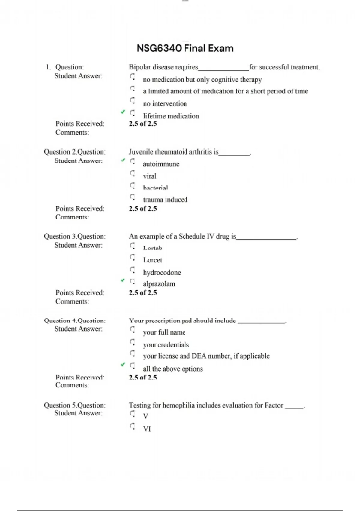 1. Question: Bipolar disease requires for successful treatment. Student Answer: no medication but only cognitive therapy a limited amount of medication for a short period of time no intervention lifetime medication Points Received: 2.5 of 2.5 Comments: Question 2.Question: Juvenile rheumatoid arthritis is . Student Answer: autoimmune viral bacterial trauma induced Points Received: 2.5 of 2.5 Comments: Question 3.Question: An example of a Schedule IV drug is . Student Answer: Lortab Lorcet hydrocodone alprazolam Points Received: 2.5 of 2.5 Comments: Question 4.Question: Your prescription pad should include . Student Answer: your full name your credentials your license and DEA number, if applicable all the above options Points Received: 2.5 of 2.5 Comments: Question 5.Question: Testing for hemophilia includes evaluation for Factor . Student Answer: V VI lOMoARcPSD| VII VIII Points Received: 2.5 of 2.5 Comments: Question 6.Question: The final word on the scope of practice for an advanced practice nurse . Student Answer: is left to the credentialing body is determined by the education of the nurse practitioner is decided by the nurse practitioner and the collaborative physician is determined by the individual boards of nursing Points Received: 2.5 of 2.5 Comments: Question 7.Question: Which statement is true regarding anorexia nervosa? Student Answer: The disease affects men and women equally. The onset is usually in the midtwenties for men and women. Depression is often found concomitantly. Individuals with anorexia nervosa are aware of the extreme thinness associated with the disease. Points Received: 2.5 of 2.5 Comments: Question 8.Question: The reliving of a very personal, negative, or traumatic event, repeatedly, is known as . Student Answer: anxiety disorder flashbacks storytelling posttraumatic stress disorder Points Received: 2.5 of 2.5 Comments: Question 9.Question: Juvenile rheumatoid arthritis is believed to be . Student Answer: hereditary viral autoimmune lOMoARcPSD| trauma induced Points Received: 2.5 of 2.5 Comments: Question 10.Question: The SSRI withdrawal system is best characterized as . Student Answer: bothersome but not life threatening potentially life threatening most often being associated with agents that have a long halflife being associated with seizure risk Points Received: 2.5 of 2.5 Comments: Question 11.Question: The two primary sources of inflammatory bowel disease are . Student Answer: Helicobacter pylori and Crohn’s disease diverticulosis and ulcerative colitis Crohn’s disease and diverticulosis Crohn’s disease and ulcerative colitis Points Received: 2.5 of 2.5 Comments: Question 12.Question: If you have concerns that a patient has suicidal ideations, you should . Student Answer: ask the patient about possible suicidal ideations in a frank and open manner ask vague and nonspecific questions about possible suicidal ideations ignore the possibility and recheck the patient in twenty-four hours ask the patient if he or she is ready to be committed Points Received: 2.5 of 2.5 Comments: Question 13.Question: An antidepressant should be taken by a patient for at least to adequately treat depressive symptoms. Student Answer: six weeks lOMoARcPSD| six months sixty months six years Points Received: 0 of 2.5 Comments: Question 14.Question: A fifteen-year-old presents at your practice, complaining of muscle weakness with fainting spells. She has recently lost 15 lb. in three months, and her parents state that she spends a lot of time by herself. In obtaining the patient history, your priority question should be regarding the girl’s . Student Answer: immunization status sexual history diet and exercise age of menarche Points Received: 2.5 of 2.5 Comments: Question 15.Question: Which of the following is true regarding an innocent murmur? Student Answer: The murmur is low in intensity. The murmur is often holosystolic. Prompt referral to a cardiologist is indicated. The murmur is heard best at the lower-left sternal border. Points Received: 2.5 of 2.5 Comments: Question 16.Question: Still’s murmur . Student Answer: has a buzzing quality is usually heard in a patient who experiences dizziness with exercise is an indication to discontinue sport participation is a sign of a cardiac anomaly Points Received: 2.5 of 2.5 Comments: Question 17.Question: An example of a Schedule I drug is . Student Answer: acetaminophen Marinol lOMoARcPSD| hydrocodone heroin Points Received: 2.5 of 2.5 Comments: Question 18.Question: Rules or regulations . Student Answer: often add details to a law or laws replace a law serve as a code of conduct negate a law Points Received: 2.5 of 2.5 Comments: Question 19.Question: Which of the following statements regarding nurse practitioners is true? Student Answer: All nurse practitioners in every state have some form of prescriptive privilege. All states allow nurse practitioners to prescribe controlled substances. No state allows nurse practitioners to prescribe controlled substances. No state allows nurse practitioners to prescribe medications. Points Received: 2.5 of 2.5 Comments: Question 20.Question: A twenty-two-year-old female presents with cachexia and yellowing skin, and her body weight is 20% below her ideal weight. You suspect she has . Student Answer: anorexia nervosa binge eating disorder depression anxiety Points Received: 2.5 of 2.5 Comments: Question 21.Question: One of the common symptoms of leukemia is . Student Answer: fever hypertension lOMoARcPSD| leukopenia polycythemia Points Received: 2.5 of 2.5 Comments: Question 22.Question: Which drug class would be utilized for an initial episode of mania? Student Answer: Fluoxetine Lithium Valproate Paroxetine Points Received: 2.5 of 2.5 Comments: Question 23.Question: Which of the following patients is at a higher risk for a suicide attempt? Student Answer: A thirty-year-old single female A twenty-five-year-old male A sixty-five-year-old widowed female An eighty-six-year-old newly wido