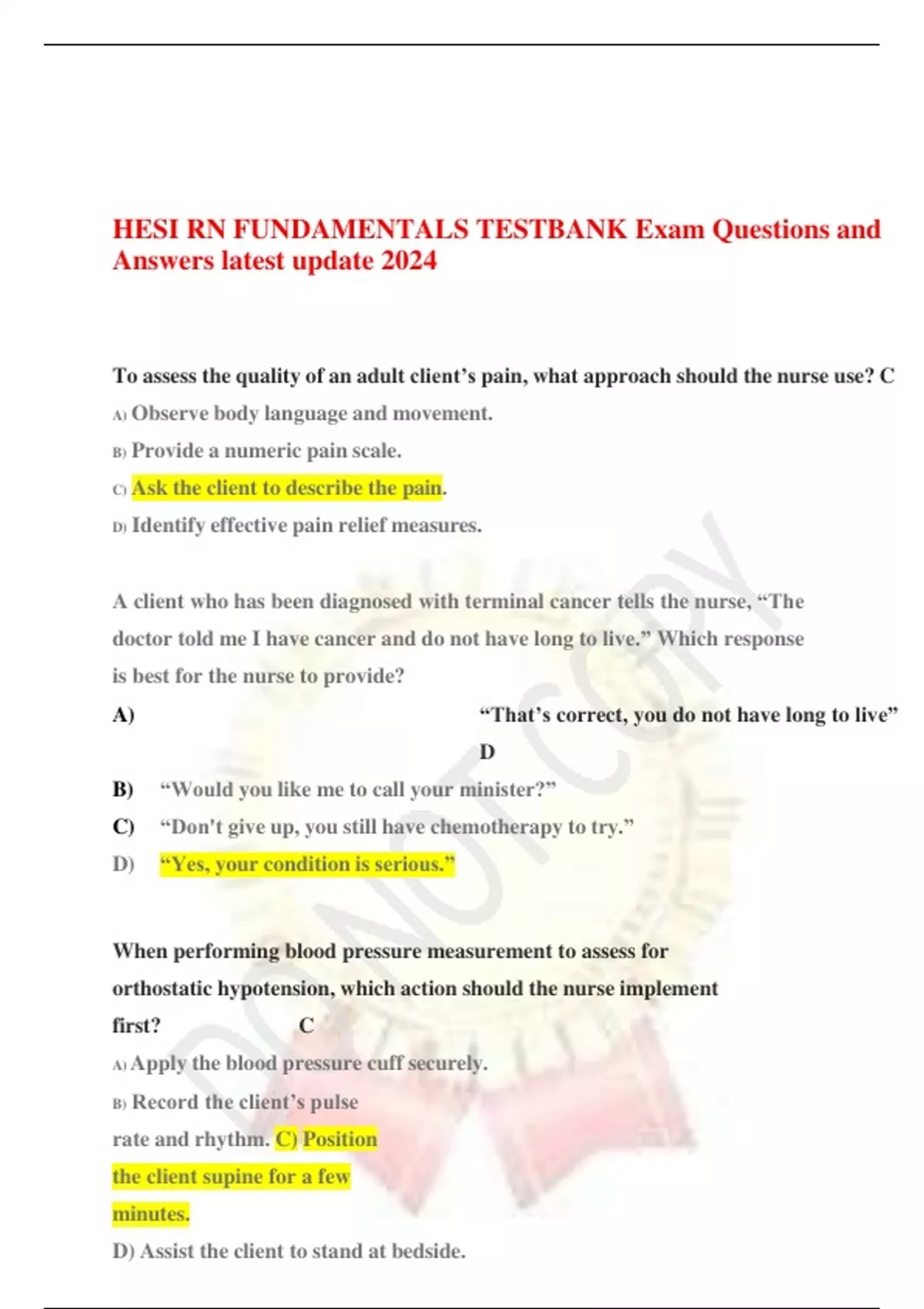 HESI RN FUNDAMENTALS TESTBANK Exam Questions and