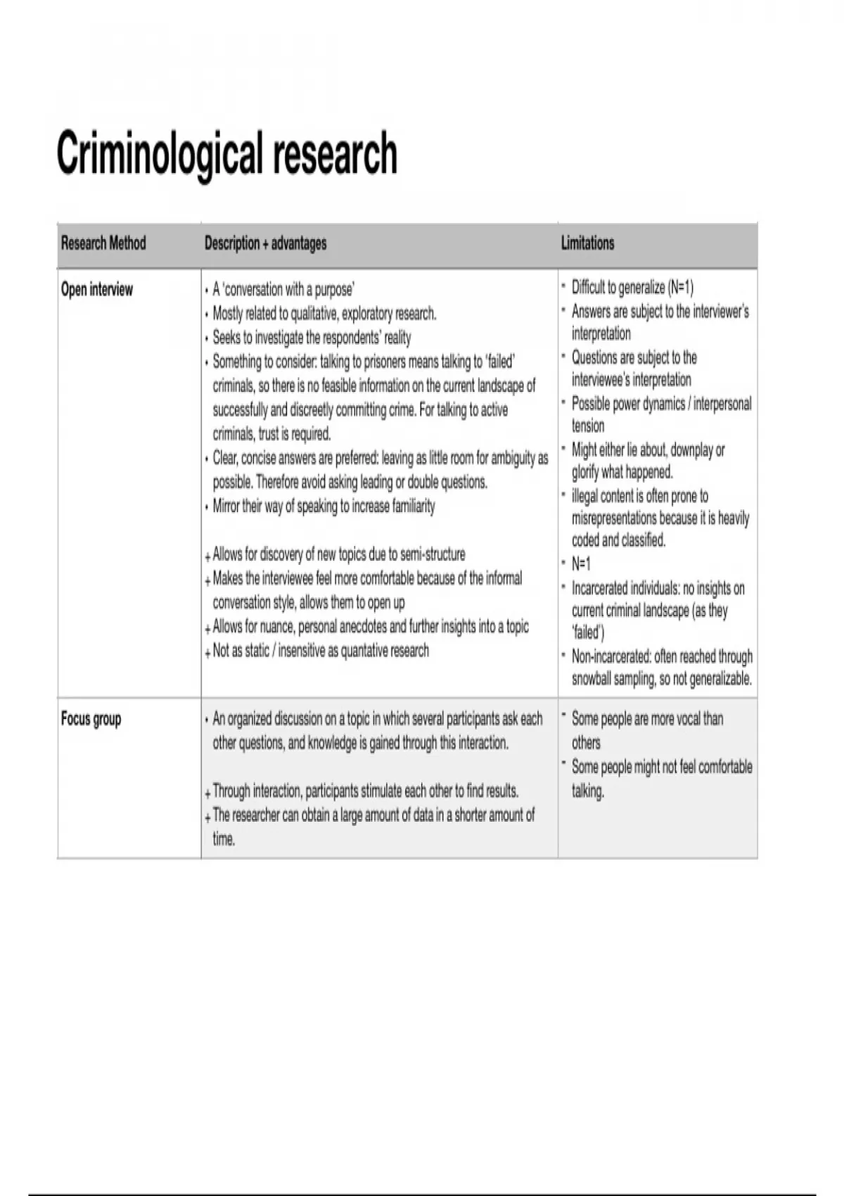 + Not as static / insensitive as quantative research - Non-incarcerated: often reached through