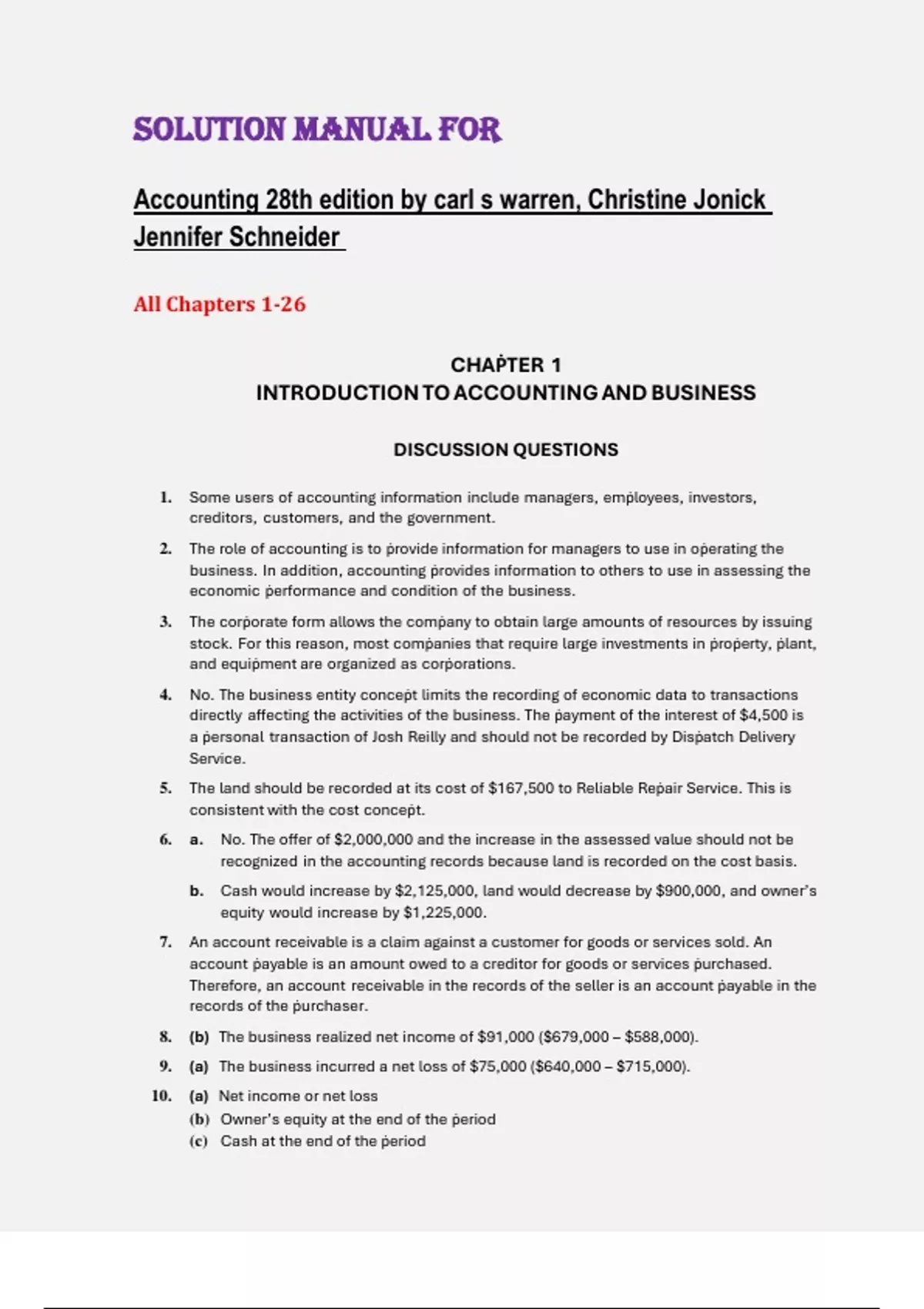 Solution manual for Accounting 28th edition by carl s warren, Christine Jonick Jennifer Schneider All Chapters 1-26