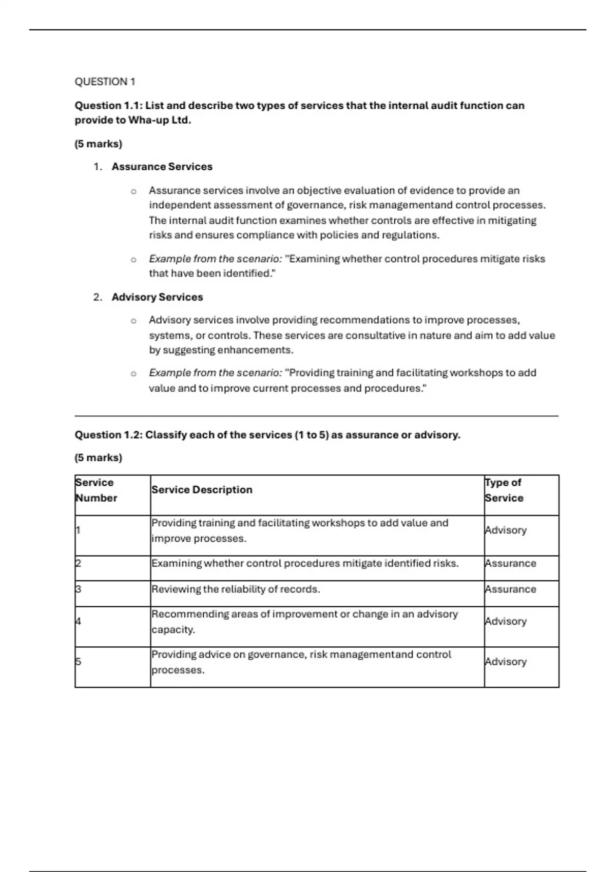Question 1.2: Classify each of the services (1 to 5) as assurance or advisory.