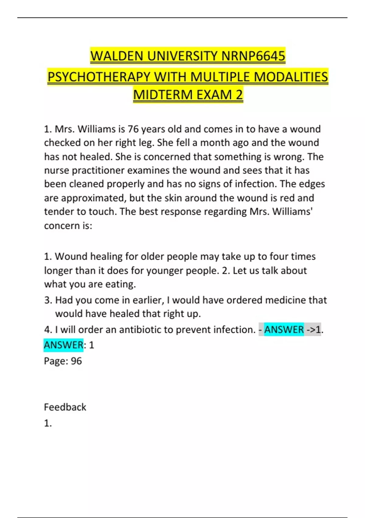 WALDEN UNIVERSITY NRNP6645 PSYCHOTHERAPY WITH MULTIPLE MODALITIES MIDTERM EXAM 2