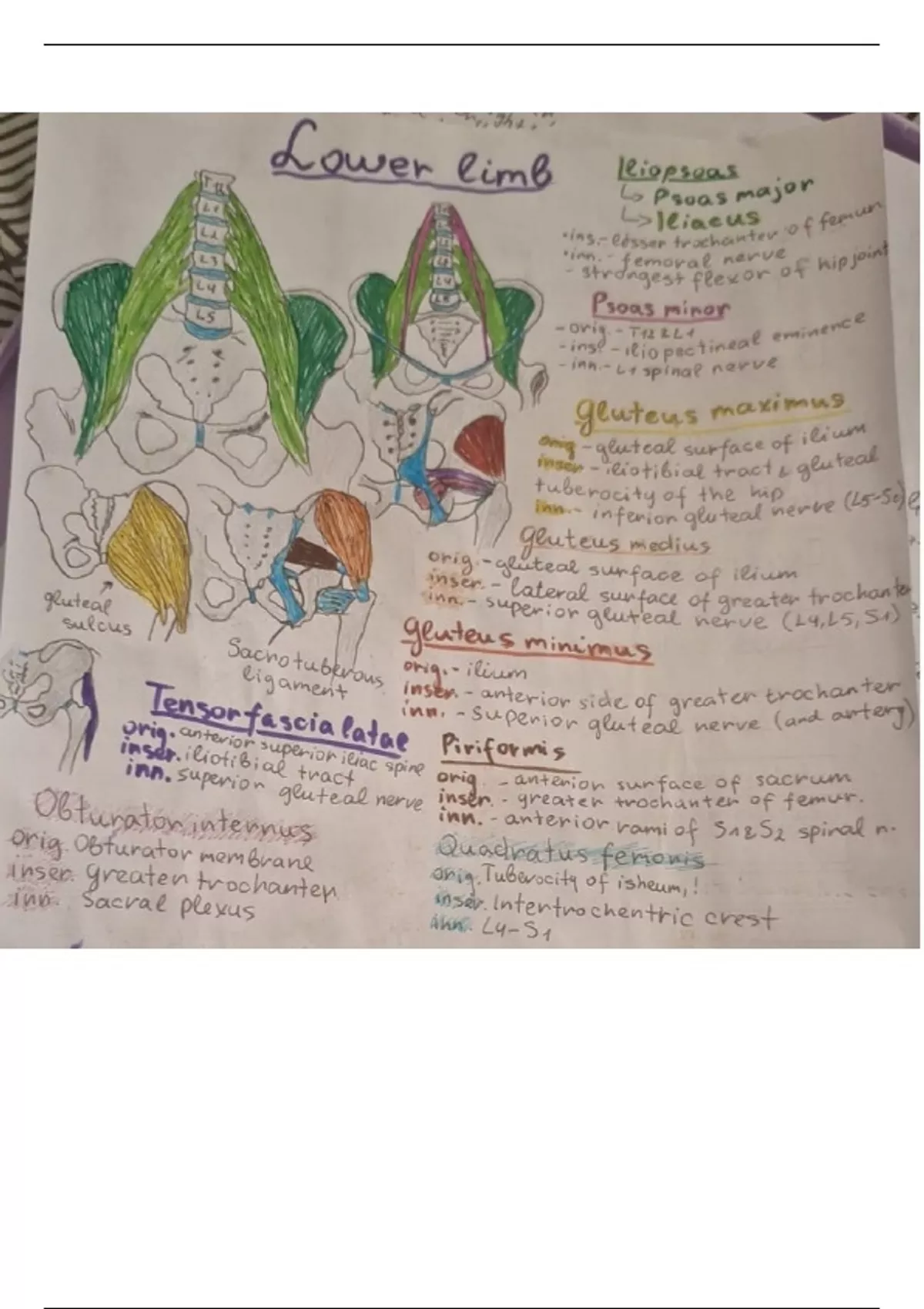 You will get an overview of hip muscles. You will see origin, insertion and innervation of muscles that are color coded on a drawing.