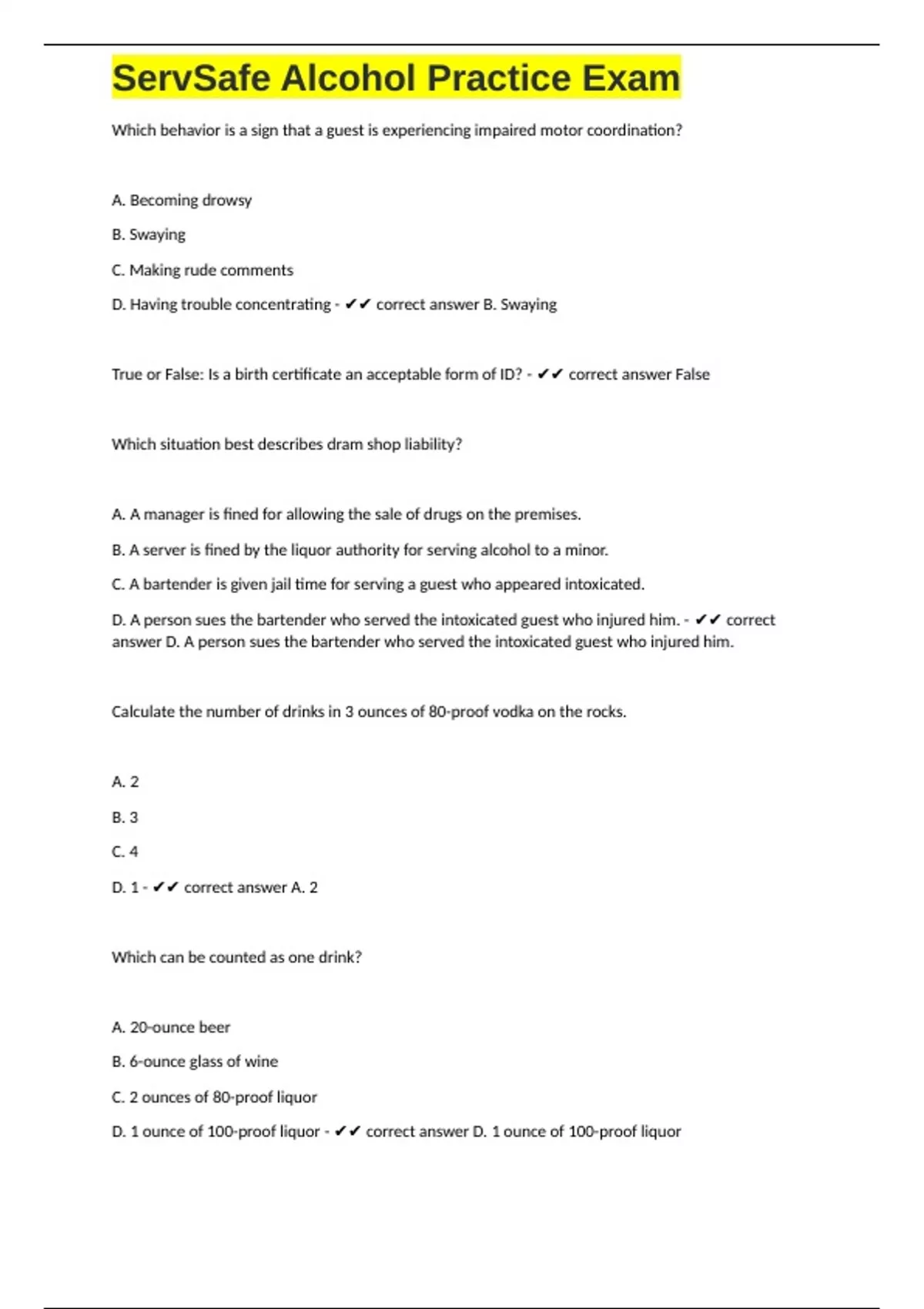 D. 1 ounce of 100-proof liquor - ✔✔ correct answer D. 1 ounce of 100-proof liquor