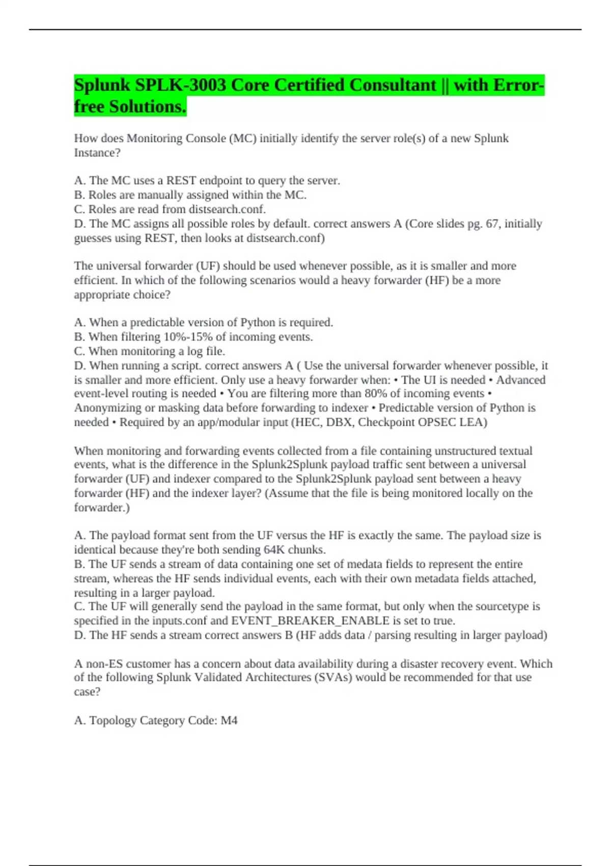 How does Monitoring Console (MC) initially identify the server role(s) of a new Splunk Instance? A. The MC uses a REST endpoint to query the server. B. Roles are manually assigned within the MC. C. Roles are read from . D. The MC assigns all possible roles by default. correct answers A (Core slides pg. 67, initially guesses using REST, then looks at ) The universal forwarder (UF) should be used whenever possible, as it is smaller and more efficient. In which of the following scenarios would a heavy forwarder (HF) be a more appropriate choice? A. When a predictable version of Python is required. B. When filtering 10%-15% of incoming events. C. When monitoring a log file. D. When running a script. correct answers A ( Use the universal forwarder whenever possible, it is smaller and more efficient. Only use a heavy forwarder when: • The UI is needed • Advanced event-level routing is needed • You are filtering more than 80% of incoming events • Anonymizing or masking data before forwarding to indexer • Predictable version of Python is needed • Required by an app/modular input (HEC, DBX, Checkpoint OPSEC LEA) When monitoring and forwarding events collected from a file containing unstructured textual events, what is the difference in the Splunk2Splunk payload traffic sent between a universal forwarder (UF) and indexer compared to the Splunk2Splunk payload sent between a heavy forwarder (HF) and the indexer layer? (Assume that the file is being monitored locally on the forwarder.) A. The payload format sent from the UF versus the HF is exactly the same. The payload size is identical because they're both sending 64K chunks. B. The UF sends a stream of data containing one set of medata fields to represent the entire stream, whereas the HF sends individual events, each with their own metadata fields attached, resulting in a larger payload. C. The UF will generally send the payload in the same format, but only when the sourcetype is specified in the and EVENT_BREAKER_ENABLE is set to true. D. The HF sends a stream correct answers B (HF adds data / parsing resulting in larger payload) A non-ES customer has a concern about data availability during a disaster recovery event. Which of the following Splunk Validated Architectures (SVAs) would be recommended for that use case? A. Topology Category Code: M4