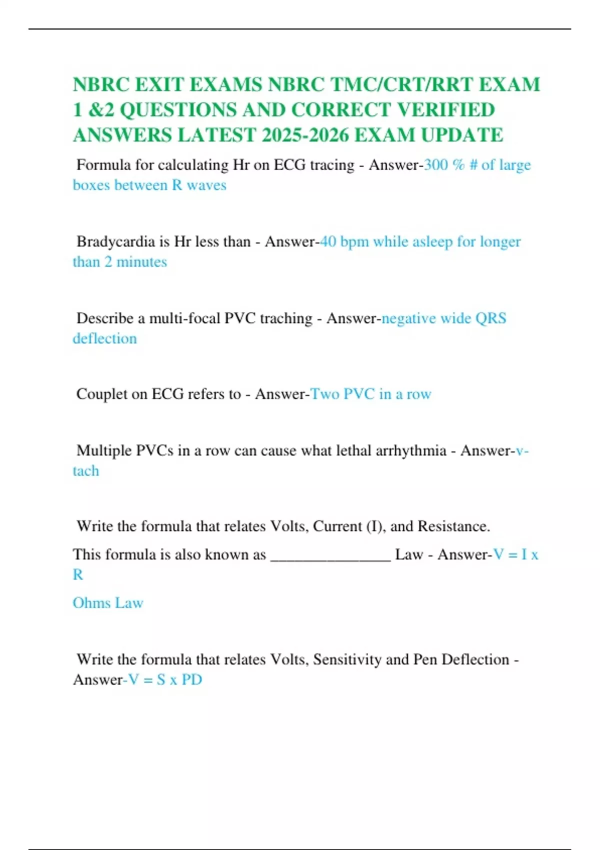 NBRC EXIT EXAMS NBRC TMC/CRT/RRT EXAM 1 &2 QUESTIONS AND CORRECT VERIFIED ANSWERS LATEST EXAM UPDATE