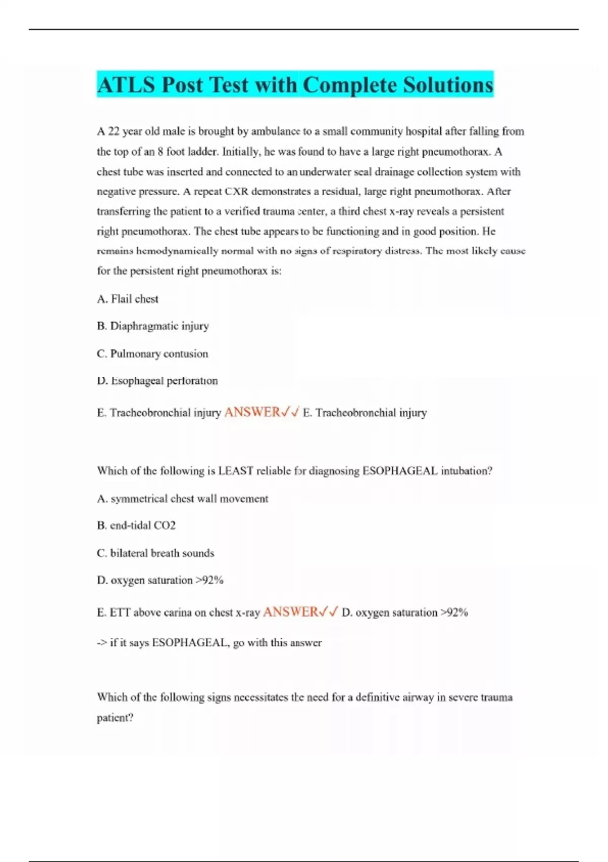 ATLS Post Test with Complete Solutions A 22 year old male is brought by ambulance to a small community hospital after falling from the top of an 8 foot ladder. Initially, he was found to have a large right pneumothorax. A chest tube was inserted and connected to an underwater seal drainage collection system with negative pressure. A repeat CXR demonstrates a residual, large right pneumothorax. After transferring the patient to a verified trauma center, a third chest x-ray reveals a persistent right pneumothorax. The chest tube appears to be functioning and in good position. He remains hemodynamically normal with no signs of respiratory distress. The most likely cause for the persistent right pneumothorax is: A. Flail chest B. Diaphragmatic injury C. Pulmonary contusion D. Esophageal perforation E. Tracheobronchial injury ANSWER E. Tracheobronchial injury Which of the following is LEAST reliable for diagnosing ESOPHAGEAL intubation? A. symmetrical chest wall movement B. end-tidal CO2 C. bilateral breath sounds D. oxygen saturation >92% E. ETT above carina on chest x-ray ANSWER D. oxygen saturation >92% -> if it says ESOPHAGEAL, go with this answer