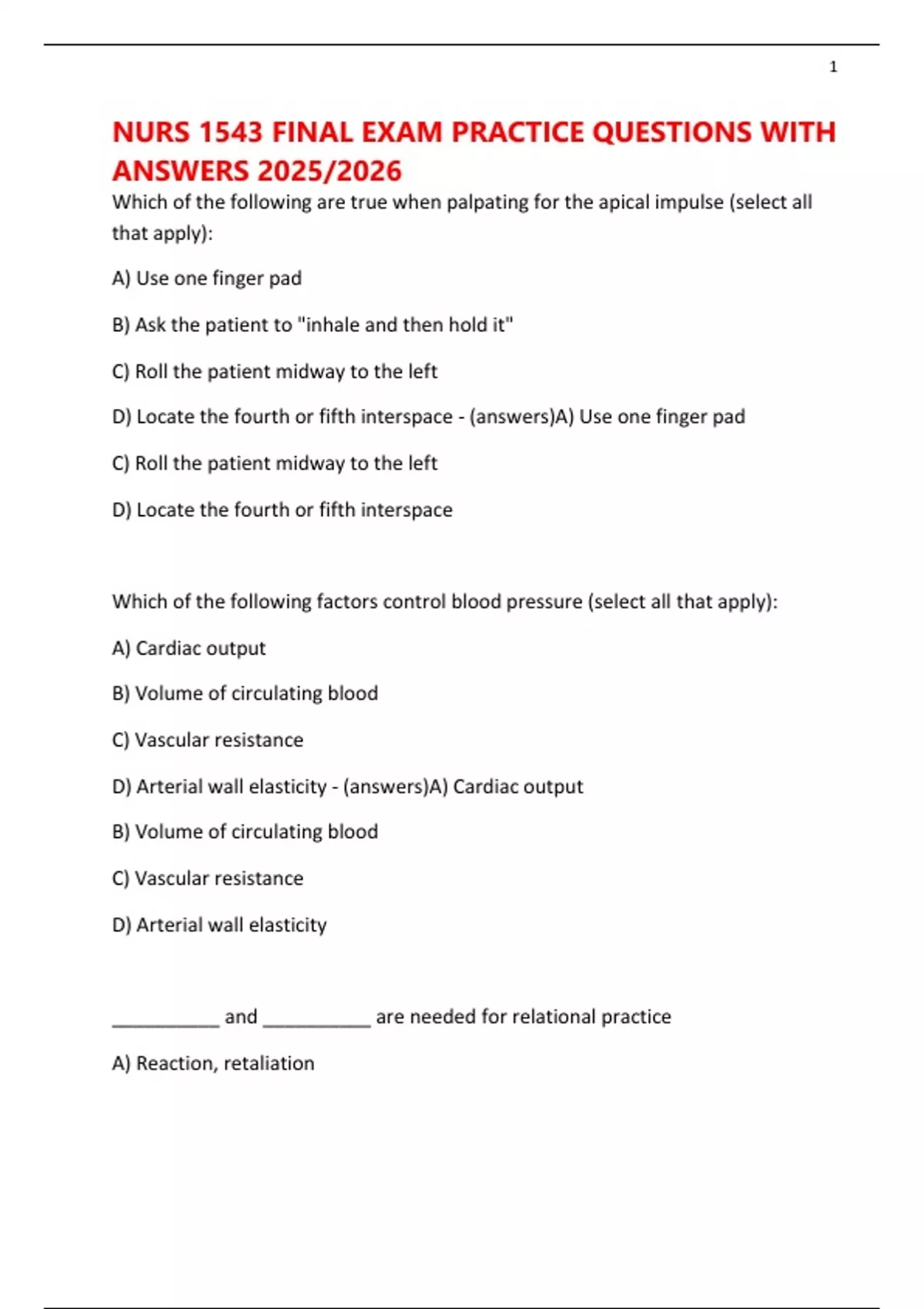NURS 1543 FINAL EXAM PRACTICE QUESTIONS WITH