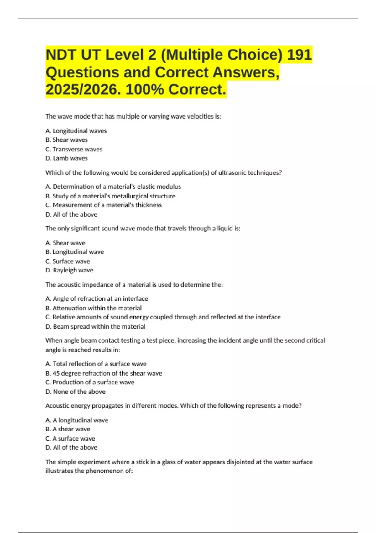 NDT UT Level 2 (Multiple Choice) 191 Questions and Correct Answers, 2025/2026. 100% Correct. The wave mode that has multiple or varying wave velocities is: A. Longitudinal waves B. Shear waves C. Transverse waves D. Lamb waves Which of the following would be considered application(s) of ultrasonic techniques? A. Determination of a material's elastic modulus B. Study of a material's metallurgical structure C. Measurement of a material's thickness D. All of the above The only significant sound wave mode that travels through a liquid is: A. Shear wave B. Longitudinal wave C. Surface wave D. Rayleigh wave The acoustic impedance of a material is used to determine the: A. Angle of refraction at an interface B. Attenuation within the material C. Relative amounts of sound energy coupled through and reflected at the interface D. Beam spread within the material