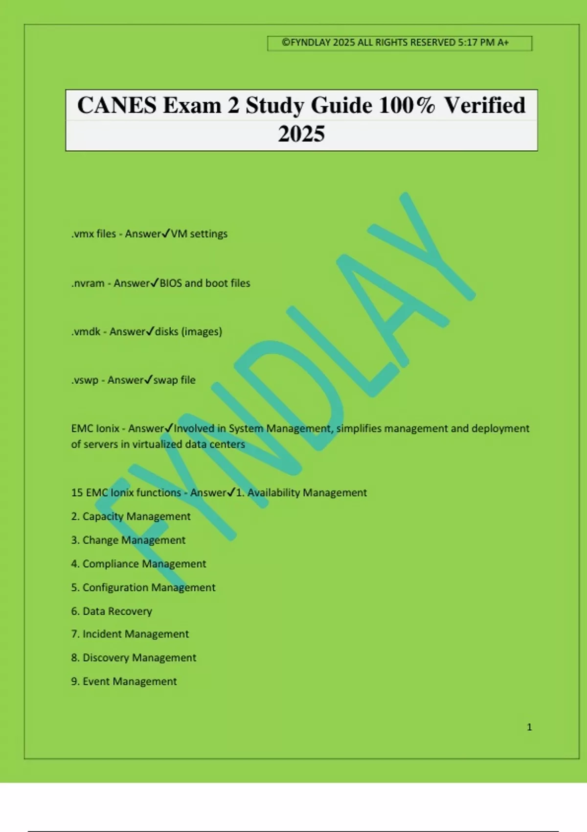 ©FYNDLAY 2025 ALL RIGHTS RESERVED 5:17 PM A+ 1 CANES Exam 2 Study Guide 100% Verified 2025 .vmx files - AnswerVM settings .nvram - AnswerBIOS and boot files .vmdk - Answerdisks (images) .vswp - Answerswap file EMC Ionix - AnswerInvolved in System Management, simplifies management and deployment of servers in virtualized data centers 15 EMC Ionix functions - Answer1. Availability Management 2. Capacity Management 3. Change Management 4. Compliance Management 5. Configuration Management 6. Data Recovery 7. Incident Management 8. Discovery Management 9. Event Management ©FYNDLAY 2025 ALL RIGHTS RESERVED 5:17 PM A+ 2 10. Performance Management 11. Problem Management 12. Provisioning Management 13. Release Management 14. Service Desk Management 15. Service Level Management /bin - Answerbinary executables (all) /boot - Answerkernel components for booting system /dev - Answerdevices attached to system /etc - Answerstartup and shutdown needed to start and stop individual programs on all configuration files /home - Answerpersonal documents, activated upon login /lib - Answerlibrary files that support the binaries /media - Answertemporary mount directory for removable media, like CDs /mnt - Answermount or attach files /opt - Answersoftware add-on packages, not part of default Linux installation /proc - Answerfiles about system processes ©FYNDLAY 2025 ALL RIGHTS RESERVED 5:17 PM A+ 3 /sbin - Answerbinary executables that sys admins use for system maintenance /srv - Answerserver specific services related data /tmp - Answertemporary files and users /usr - Answercontains binaries, libraries, documentation, graphics, and source code for any second level user applications /var - Answercontains data that constantly changes while the system is running i.e. log files Application Layer - AnswerOutermost layer Application software Shell Layer - AnswerCLI Kernel layer - AnswerClosest to hardware BIOS, schedules tasks and processes, file management, and storage gzip - AnswerCompress or decompress named file(s) ls - Answerlist directory zip - Answercompressing files to reduce file size