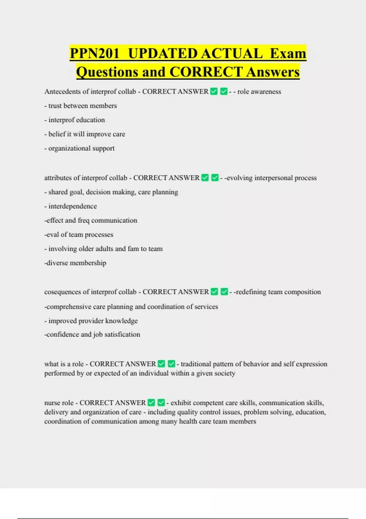 PPN201 UPDATED ACTUAL Exam Questions and CORRECT Answers Antecedents of interprof collab - CORRECT ANSWER - trust between members - interprof education - belief it will improve care - organizational support attributes of interprof collab - CORRECT ANSWER - shared goal, decision making, care planning - interdependence -effect and freq communication -eval of team processes - involving older adults and fam to team -diverse membership cosequences of interprof collab - CORRECT ANSWER -comprehensive care planning and coordination of services - improved provider knowledge -confidence and job satisfication what is a role - CORRECT ANSWER - - role awareness - -evolving interpersonal process