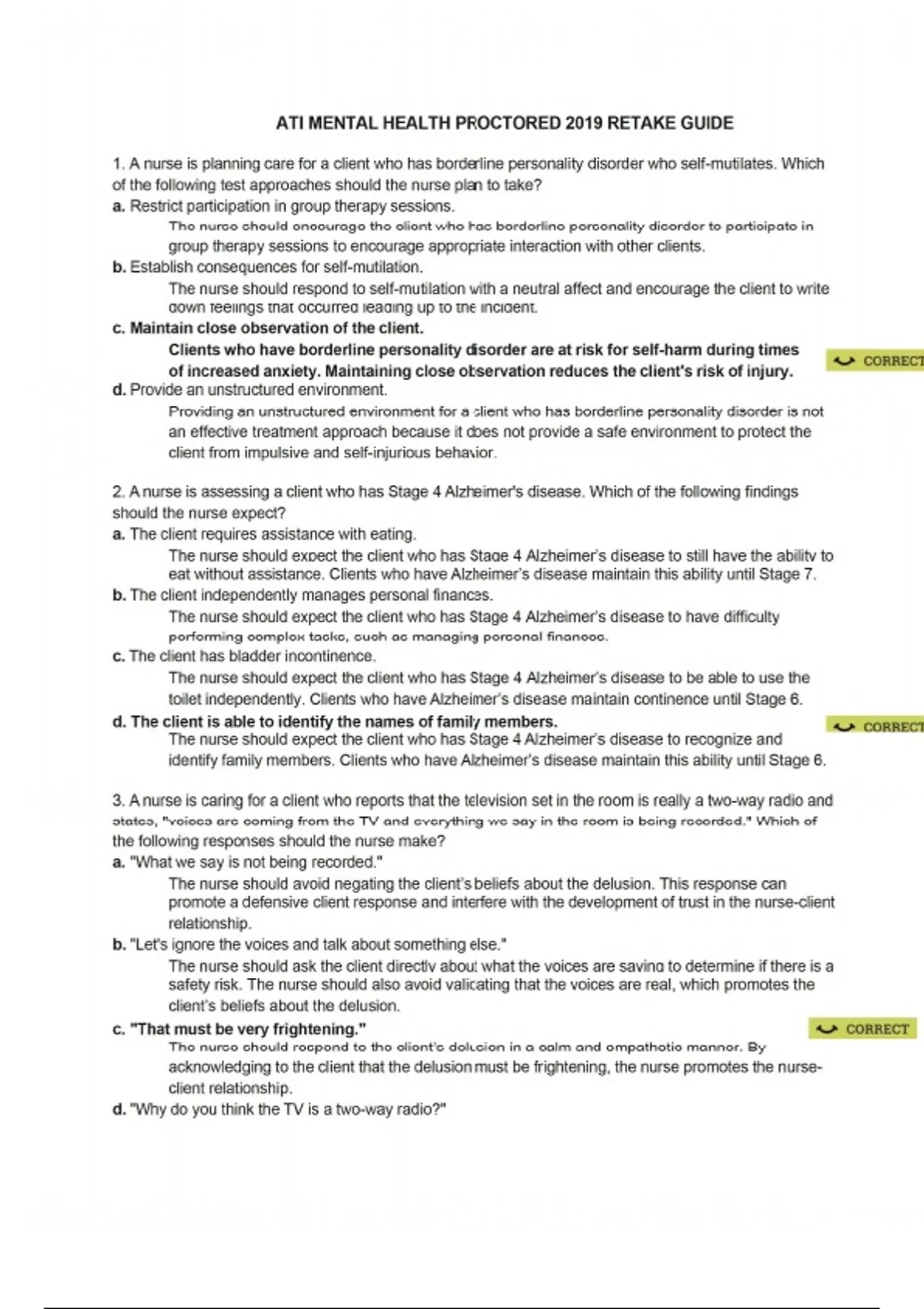ATI MENTAL HEALTH PROCTORED 2019 RETAKE GUIDE