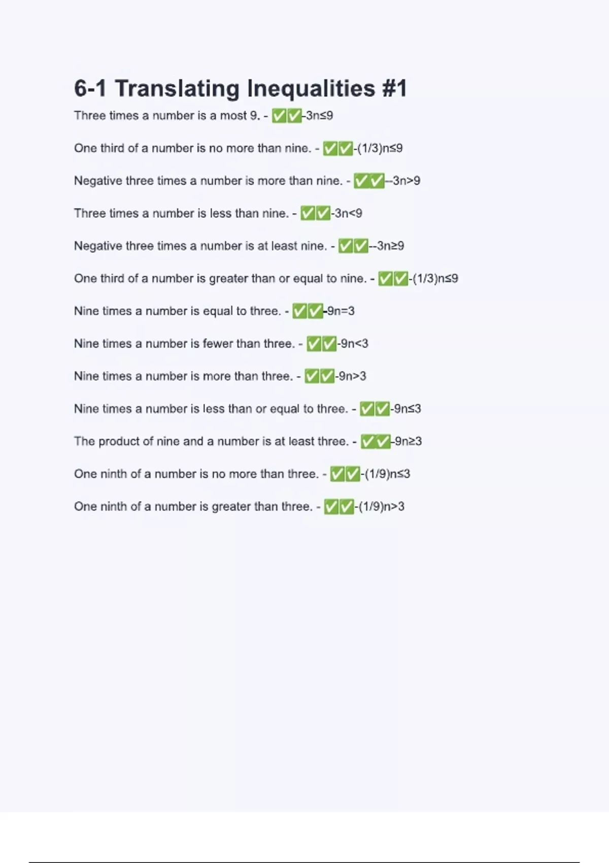 6-1 Translating Inequalities -1 Questions and and answers.