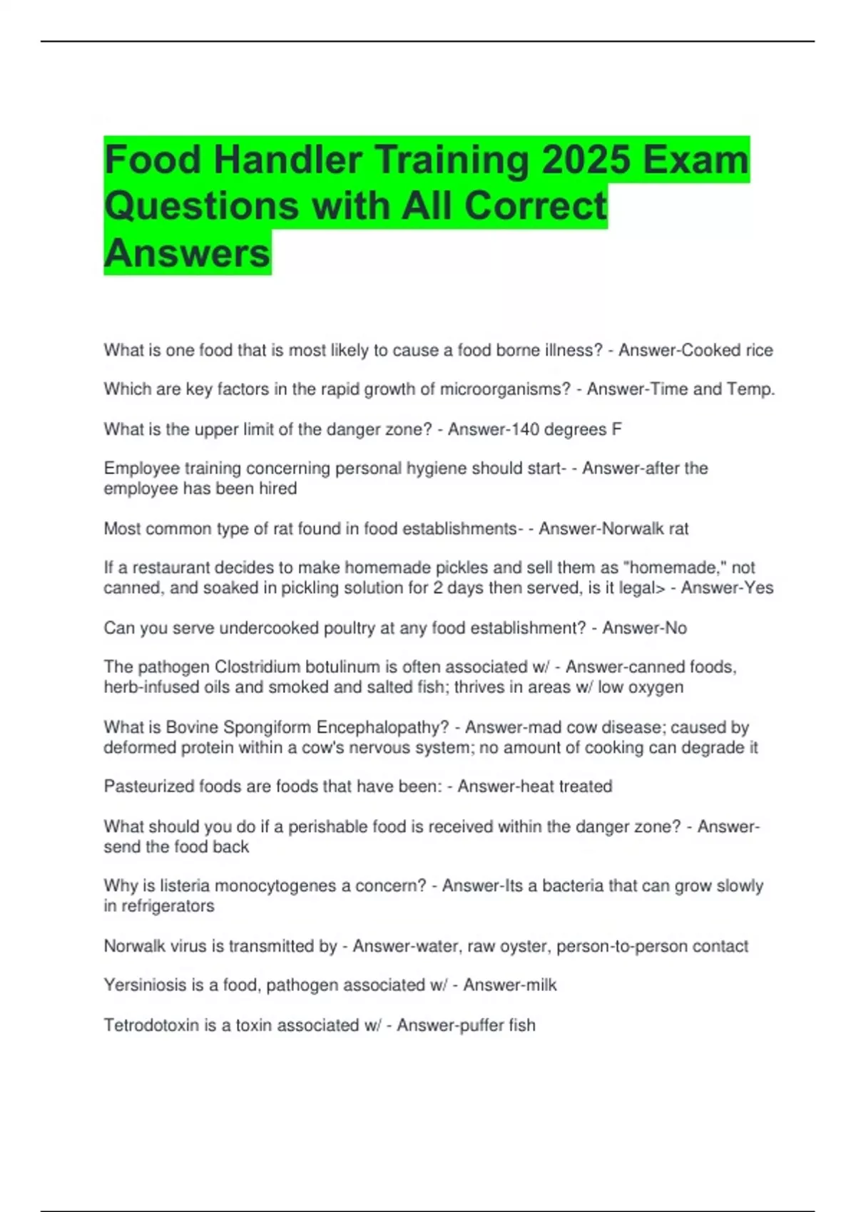 Food Handler Training 2025 Exam Questions with All Correct Answers