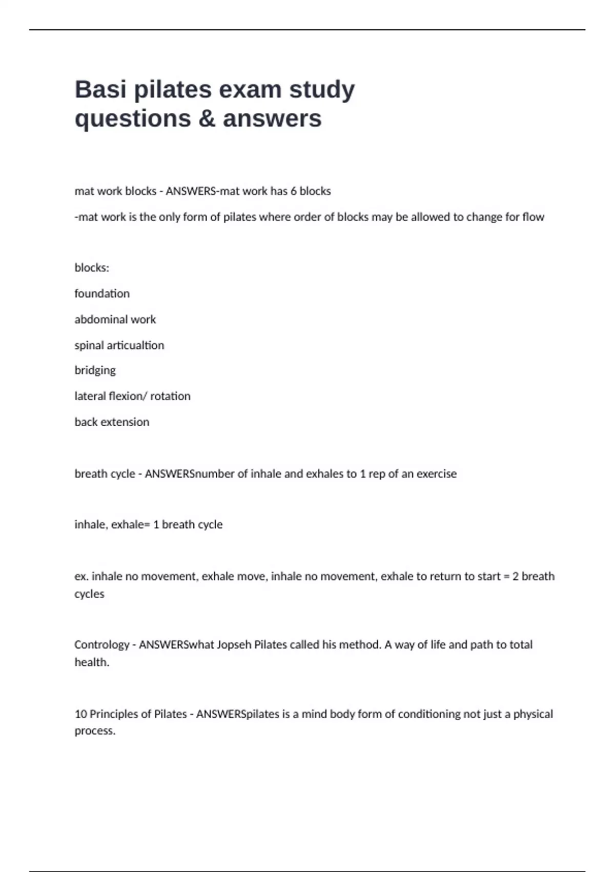 Basi pilates exam study questions & answers mat work blocks - ANSWERS-mat work has 6 blocks -mat work is the only form of pilates where order of blocks may be allowed to change for flow blocks: foundation abdominal work spinal articualtion bridging lateral flexion/ rotation back extension breath cycle - ANSWERSnumber of inhale and exhales to 1 rep of an exercise inhale, exhale= 1 breath cycle ex. inhale no movement, exhale move, inhale no movement, exhale to return to start = 2 breath cycles Contrology - ANSWERSwhat Jopseh Pilates called his method. A way of life and path to total health. 10 Principles of Pilates - ANSWERSpilates is a mind body form of conditioning not just a physical process.