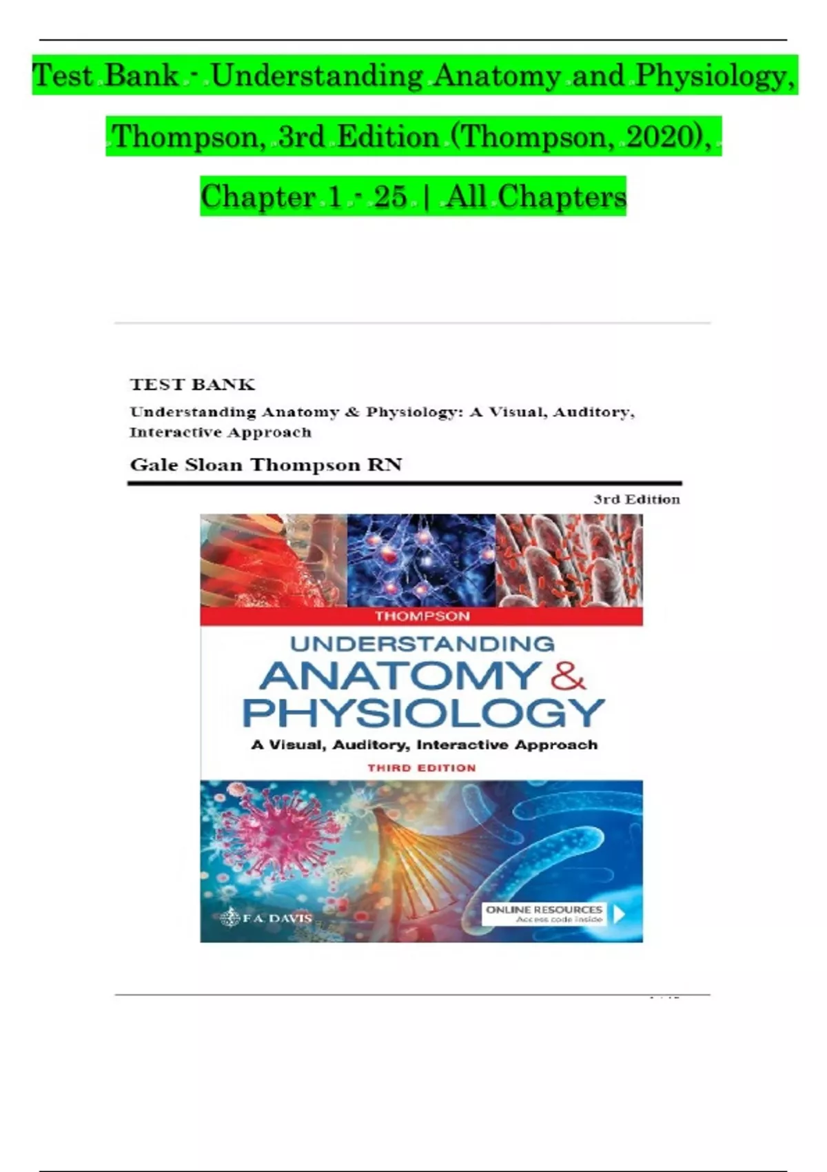 Test Bank for Understanding Anatomy and Physiology, Thompson, 3rd Edition (Thompson, 2020), Chapter 1-25 | All Chapters