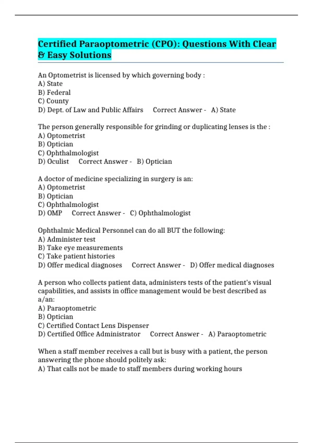 D) Certified Office Administrator Correct Answer - A) Paraoptometric
