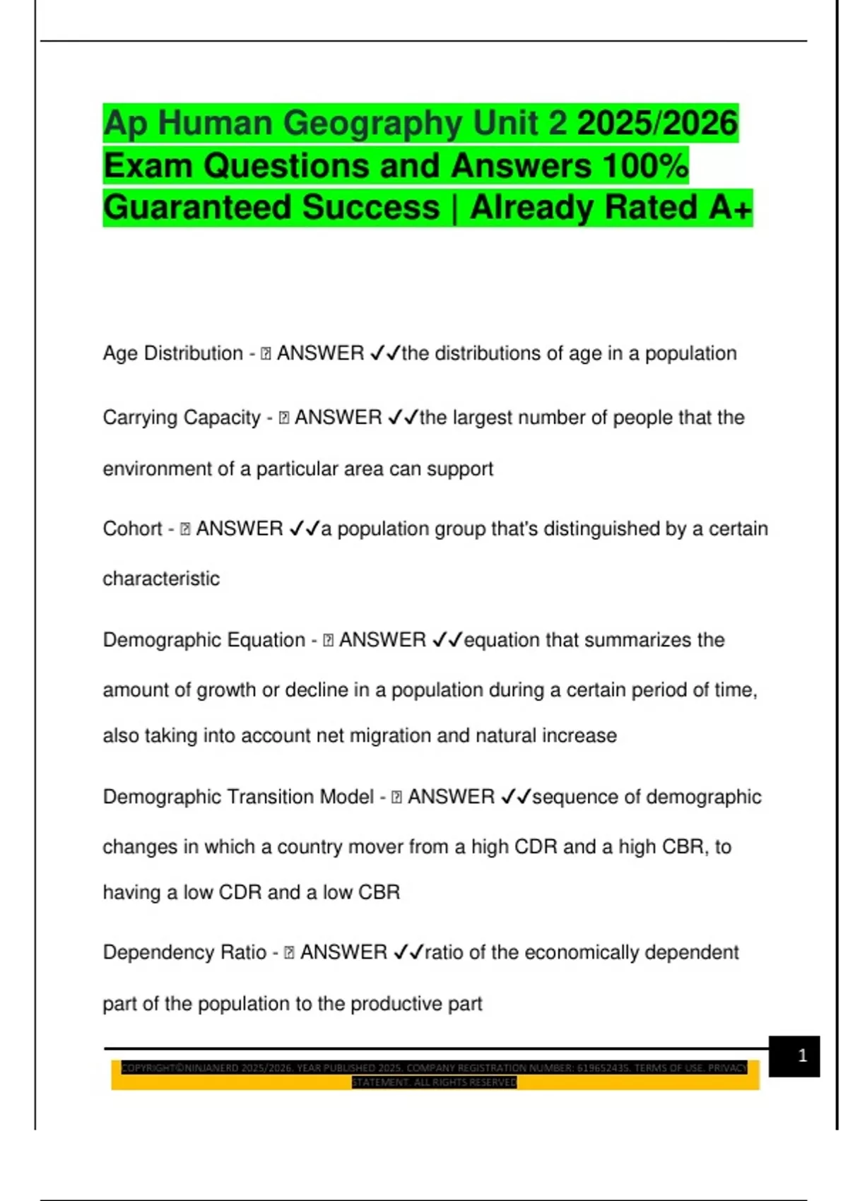 Ap Human Geography Unit 2 2025/2026 Exam Questions and Answers 100% Guaranteed Success | Already Rated A+ Age Distribution -