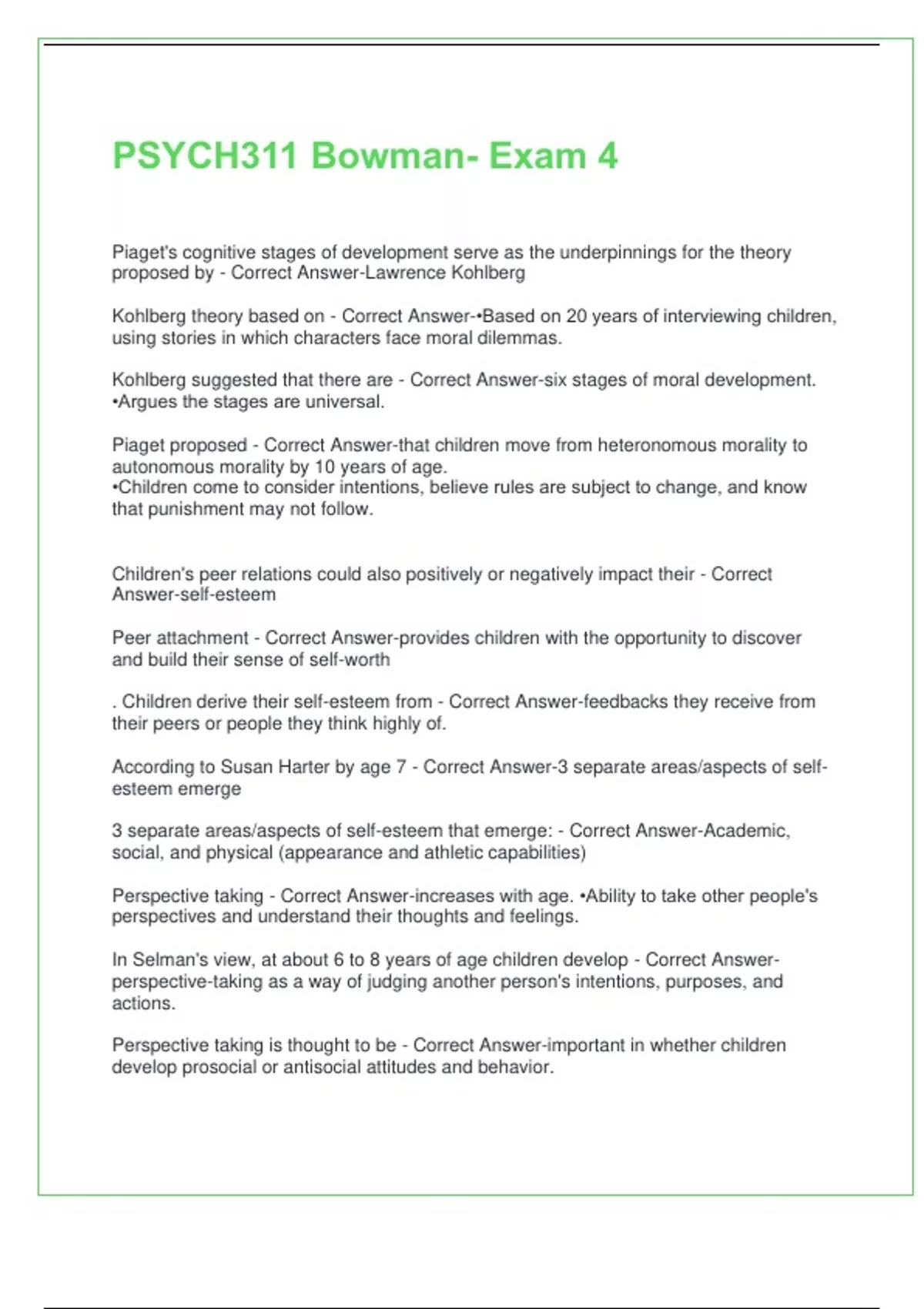 Kohlberg theory based on - Correct Answer-•Based on 20 years of interviewing children,