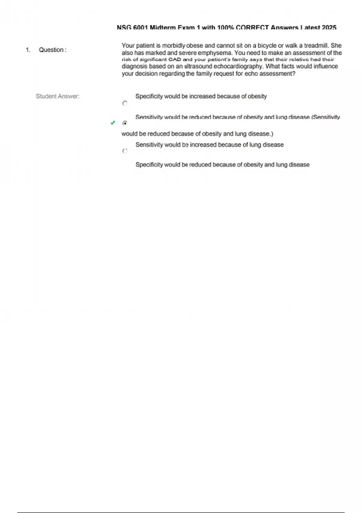 1. Question : Your patient is morbidly obese and cannot sit on a bicycle or walk a treadmill. She also has marked and severe emphysema. You need to make an assessment of the risk of significant CAD and your patient’s family says that their relative had their diagnosis based on an ultrasound echocardiography. What facts would influence your decision regarding the family request for echo assessment? Student Answer: Specificity would be increased because of obesity Sensitivity would be reduced because of obesity and lung disease (Sensitivity would be reduced because of obesity and lung disease.) Sensitivity would be increased because of lung disease Specificity would be reduced because of obesity and lung disease 2. Question : Medicaid is mandated to be provided by each state through federal codes. Each state must offer Medicaid exactly as the federal government prescribes. True or false? 3. Question : By standard criteria, how is a positive stress test defined? 4. Question : Population disease management is a term used to describe: Student Answer: Low prevalence specific diseases High prevalence specific diseases (Population disease management is a term used to describe the high prevalence of specific diseases. ) Low specificity diseases states High specificity disease states 5. Question : What are two of the most common forms of Exercise Stress Tests used today? Student Answer: Bicycle and treadmill (Bicycle and treadmill are the two most common forms of exercise stress tests used today. ) Unicycle and Running in pace Thallium and Dobutamine Bicycle and rowing machine