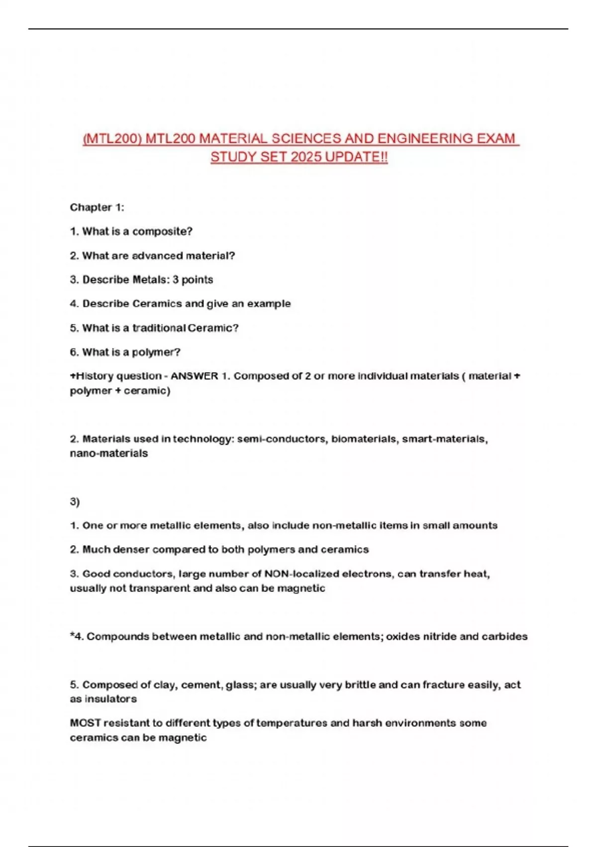 (MTL200) MTL200 MATERIAL SCIENCES AND ENGINEERING EXAM STUDY SET 2025 UPDATE!!...
