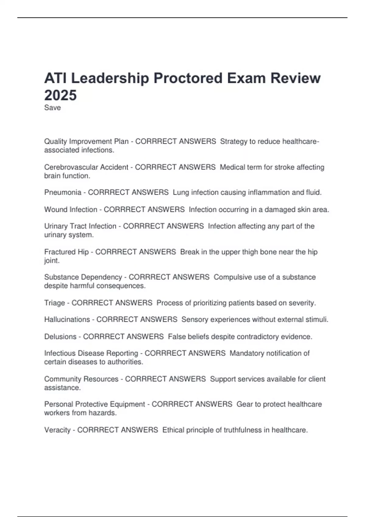 Pneumonia - CORRRECT ANSWERS Lung infection causing inflammation and fluid.