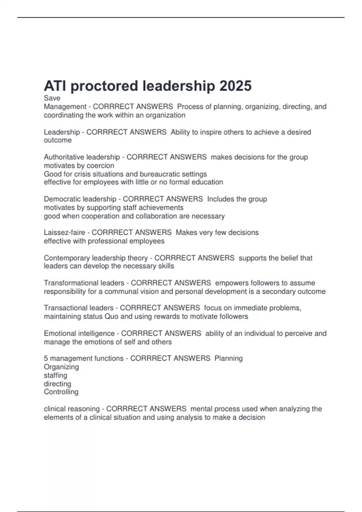 Leadership - CORRRECT ANSWERS Ability to inspire others to achieve a desired