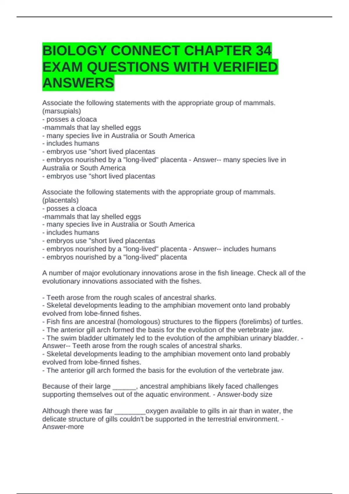 BIOLOGY CONNECT CHAPTER 34 EXAM QUESTIONS WITH VERIFIED ANSWERS