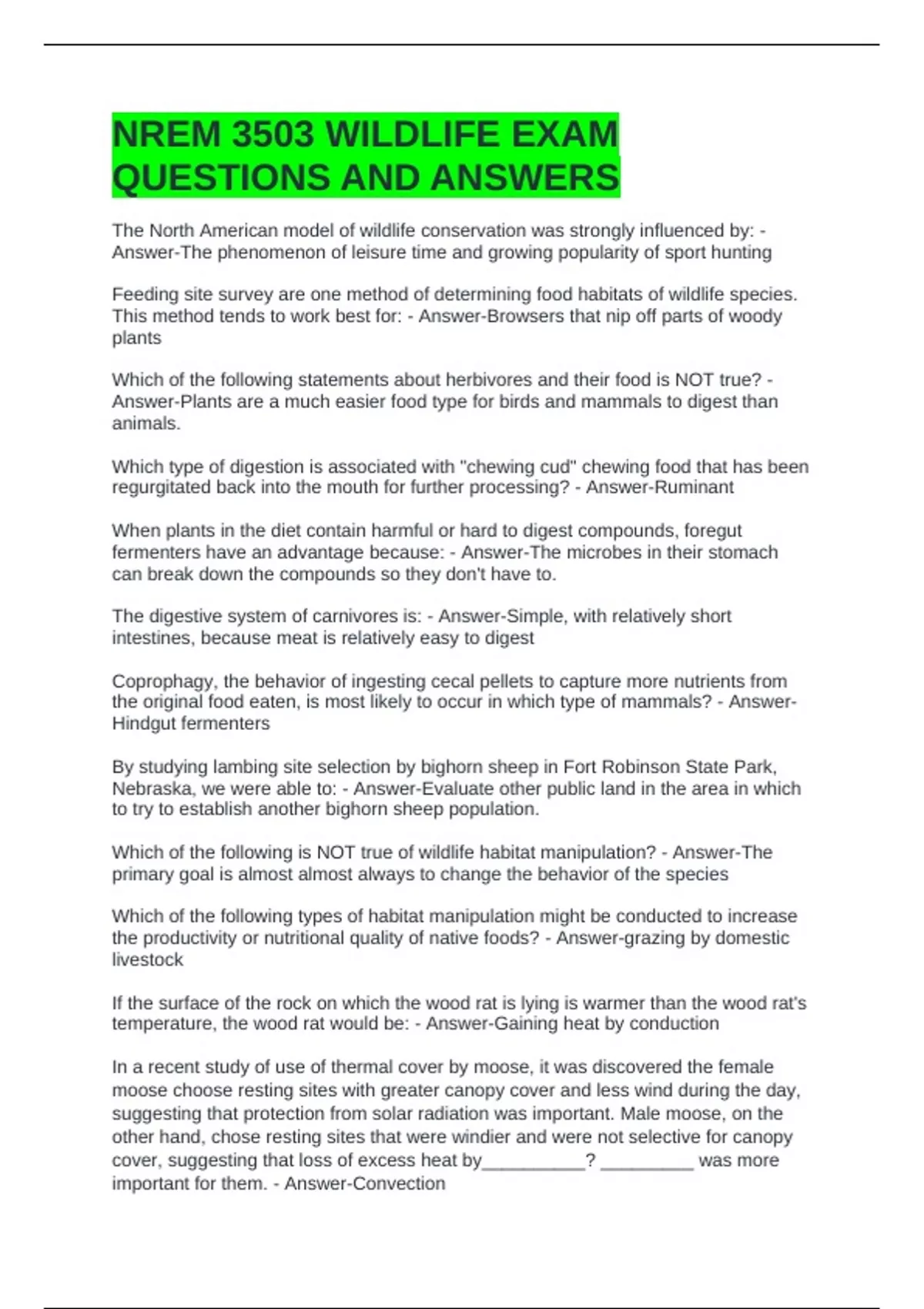 NREM 3503 WILDLIFE EXAM QUESTIONS AND ANSWERS