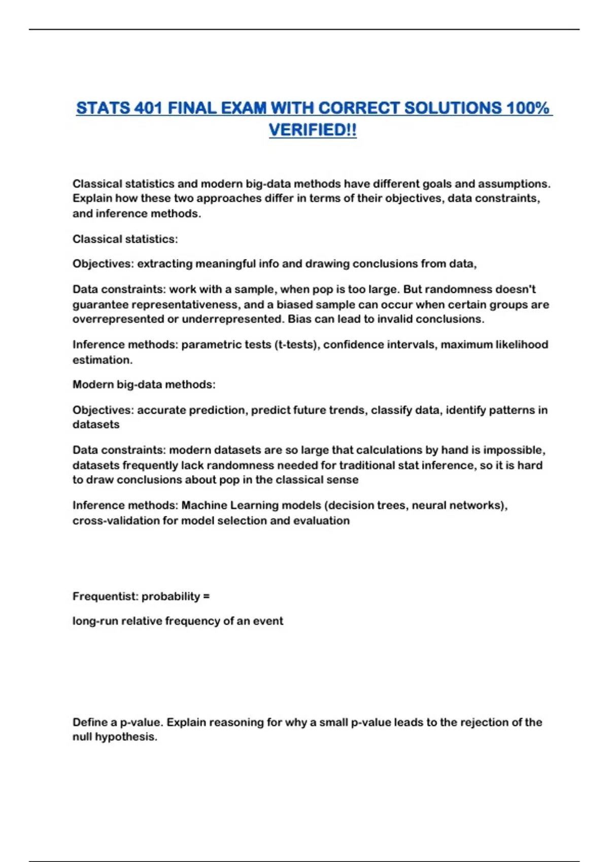 STATS 401 FINAL EXAM WITH CORRECT SOLUTIONS 100%