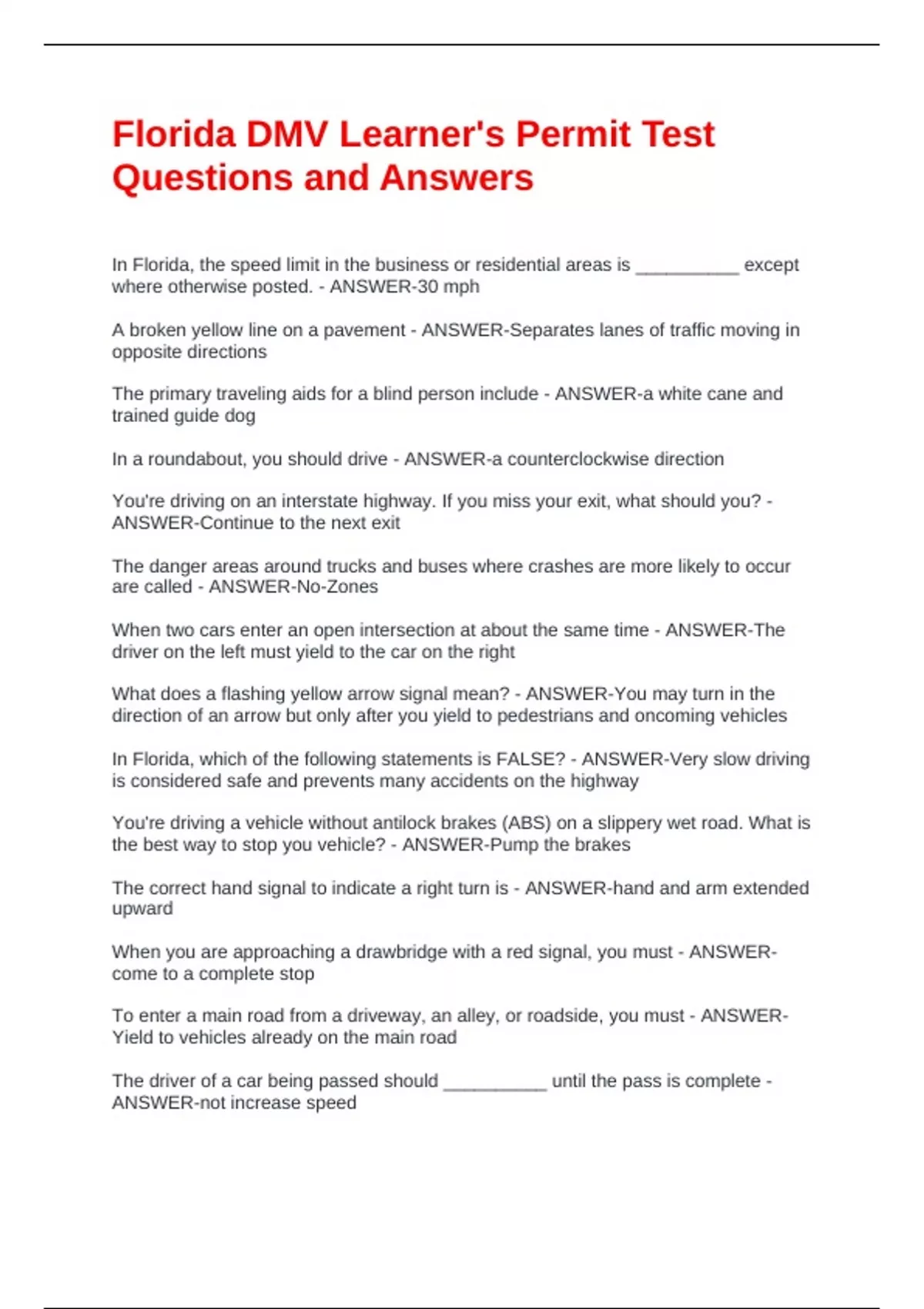 Florida DMV Learner's Permit Test