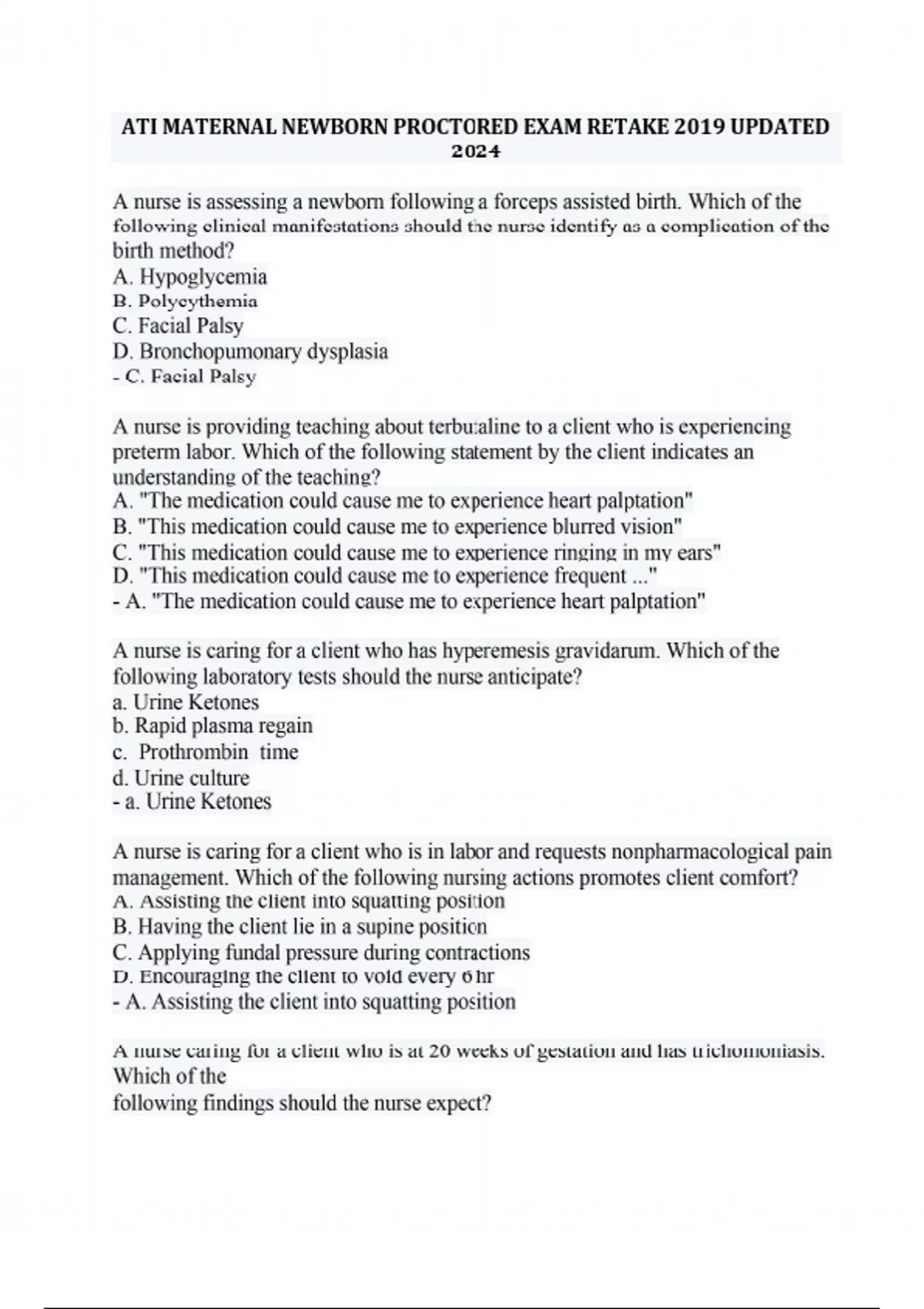 A. Thick, White Vaginal Discharge B. Urinary Frequency C. Vulva Lesions D. Malodorous Discharge - D. Malodorous Discharge A nurse is caring for a client who is 14 weeks of gestation. At which the following locations should the nurse place the Doppler device when assessing the fetal heart rate? A. Midline 2 to 3 cm (0.8 to 1.2 in) above the symphysis pubis B. Left Upper Abdomen C. Two fingerbreadths above the umbilicus D. Lateral at the Xiphoid Proces - A. Midline 2 to 3 cm (0.8 to 1.2 in) above the symphysis pubis A nurse is assessing a client who is at 27 weeks of gestation and has preeclampsia. Which of the following findings should the nurse report to the provider? A. Urine protein concentration 200 mg/ 24 hr B. Creatinine 0.8 mg/ dL C. Hemoglobin 14.8 g/ dL D. Platelet Count 60.000/ mm3 - D. Platelet Count 60.000/ mm3 A nurse is teaching about clomiphene citrate to a client who is experiencing infertility. Which of the following adverse effect should the nurse include? A. Tinnitus B. Urinary Frequency C. Breast Tenderness D. Chills - C. Breast Tenderness A nurse is assessing a newborn upon admission to the nursery. Which of the following should the nurse expect? A. Bulging Fontanels B. Nasal Flaring C. Length from head to heel of 40 cm (15.7 in) D. Chest circumference 2 cm (0.8 in) smaller than the head circumference - D. Chest circumference 2 cm (0.8 in) smaller than the head circumference