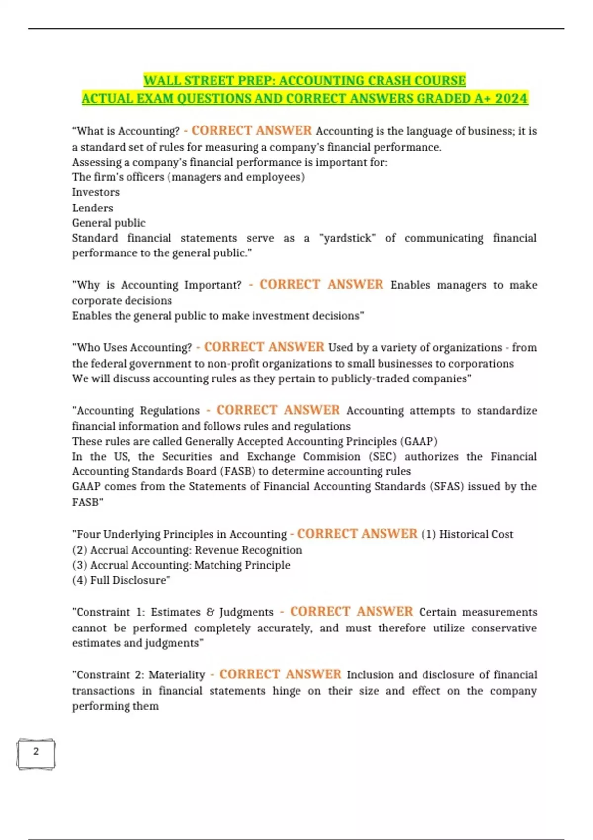 WALL STREET PREP: ACCOUNTING CRASH COURSE ACTUAL EXAM QUESTIONS AND CORRECT ANSWERS GRADED A+ 2024 “What is Accounting? - CORRECT ANSWER Accounting is the language of business; it is a standard set of rules for measuring a company's financial performance. Assessing a company's financial performance is important for: The firm's officers (managers and employees) Investors Lenders General public Standard financial statements serve as a "yardstick" of communicating financial performance to the general public." "Why is Accounting Important? - CORRECT ANSWER Enables managers to make corporate decisions Enables the general public to make investment decisions" "Who Uses Accounting? - CORRECT ANSWER Used by a variety of organizations - from the federal government to non-profit organizations to small businesses to corporations We will discuss accounting rules as they pertain to publicly-traded companies" "Accounting Regulations - CORRECT ANSWER Accounting attempts to standardize financial information and follows rules and regulations These rules are called Generally Accepted Accounting Principles (GAAP) In the US, the Securities and Exchange Commision (SEC) authorizes the Financial Accounting Standards Board (FASB) to determine accounting rules GAAP comes from the Statements of Financial Accounting Standards (SFAS) issued by the FASB" "Four Underlying Principles in Accounting - CORRECT ANSWER (1) Historical Cost (2) Accrual Accounting: Revenue Recognition (3) Accrual Accounting: Matching Principle (4) Full Disclosure" "Constraint 1: Estimates & Judgments - CORRECT ANSWER Certain measurements cannot be performed completely accurately, and must therefore utilize conservative estimates and judgments" "Constraint 2: Materiality - CORRECT ANSWER Inclusion and disclosure of financial transactions in financial statements hinge on their size and effect on the company performing them Note: Materiality varies across different entities" "Constraint 3: Consistency - CORRECT ANSWER Each company has to prepare financial statements using measurement techniques and assumptions which are consistent from one period to another" "Constraint 4: Conservatism - CORRECT ANSWER Financial statements should be prepared with a downward measurement bias Assets and revenues should not be overstated, while liabilities and expenses should not be understated" "Four Underlying Constraints in Accounting - CORRECT ANSWER (1) Estimates & judgments (2) Materiality (3) Consistency (4) Conservatism" "T/F: GAAP requires that firms show recorded values for acquired intangible assets such as patents and trademarks on their financial statements - CORRECT ANSWER True! GAAP requires that firms only show measurable activities, such as the value of acquired intangible assets Assets such as employee, customer loyalty, and internally-developed trademarks are not shown on financial statements" "CVS Revenue Exercise - CORRECT ANSWER Note: How much you collect in cash is irrelevant in revenue; it is how much you EARNED during the period" "Revenue Recognition - CORRECT ANSWER Accrual accounting dictates that revenue must be recorded only when it is earned and measurable In other words, until an order is shipped to a customer and collection from that customer is reasonably assured" "Revenue Recognition: Multiple Deliverables - CORRECT ANSWER For sales of bundled products, companies should assign individual values to each of the bundled components This is especially relevant in the software industry (see picture)" "Revenue Recognition: Long-Term Projects - CORRECT ANSWER Companies have some flexibility with long-term project revenue recognition (1) Percentage of Completion Method: Revenues are recognized on the basis of the percentage of total work completed during the accounting period (2) Completed Contract Method: Rarely used in the US; allows revenue recognition only once the entire project has been completed" "Matching Principle - CORRECT ANSWER Expenses should be "matched" to revenues The costs of manufacturing a product are matched to the revenue generated from that product during the same period" "Accrual Accounting - CORRECT ANSWER Revenues are recognized and recorded when an economic exchange occurs, while expenses are recognized when the associated revenues are recognized, not necessarily when cash is exchanged" "What would happen if we recognized expenses when they are incurred like revenue? - CORRECT ANSWER Shows an inaccurate depiction of a company's profitability" "Accrual vs. Cash Accounting - CORRECT ANSWER Although the benefits of the accrual method are apparent, it has the limitation that analysts cannot track objectively the movement of cash The cash flow statement allows analysts to reconcile these differences Cash accounting is more objective; accrual accounting is more subjective" "Cash Accounting - CORRECT ANSWER Not allowed under GAAP but used for tax reporting for certain businesses Objectively recognizes revenues when cash is received and records costs when cash is paid out" "Revenue Manipulation - CORRECT ANSWER Because of accrual accounting, revenue recognition can be subjective This "wiggle room" creates potential for manipulation in the form of shifting revenues from one period to another While revenue recognition methods are almost always explained in companies' 10K footnotes, when there is suspicion of "shenanigans," these should be read carefully" "Expense of Employee Salaries - CORRECT ANSWER The expense of employee salaries are embedded within the expense categories based on the employee's job function A corporate manger or sale person's salary will be in SG&A The salary of a software engineer will be in R&D The salary of a factory supervisor at a tire manufacturer will be in COGS" "Stock Based Compensation Expense - CORRECT ANSWER When a company compensates an employee with stock (like stock options or restricted stock), the value of that compensation is recognized as an expense in the same expense category as the