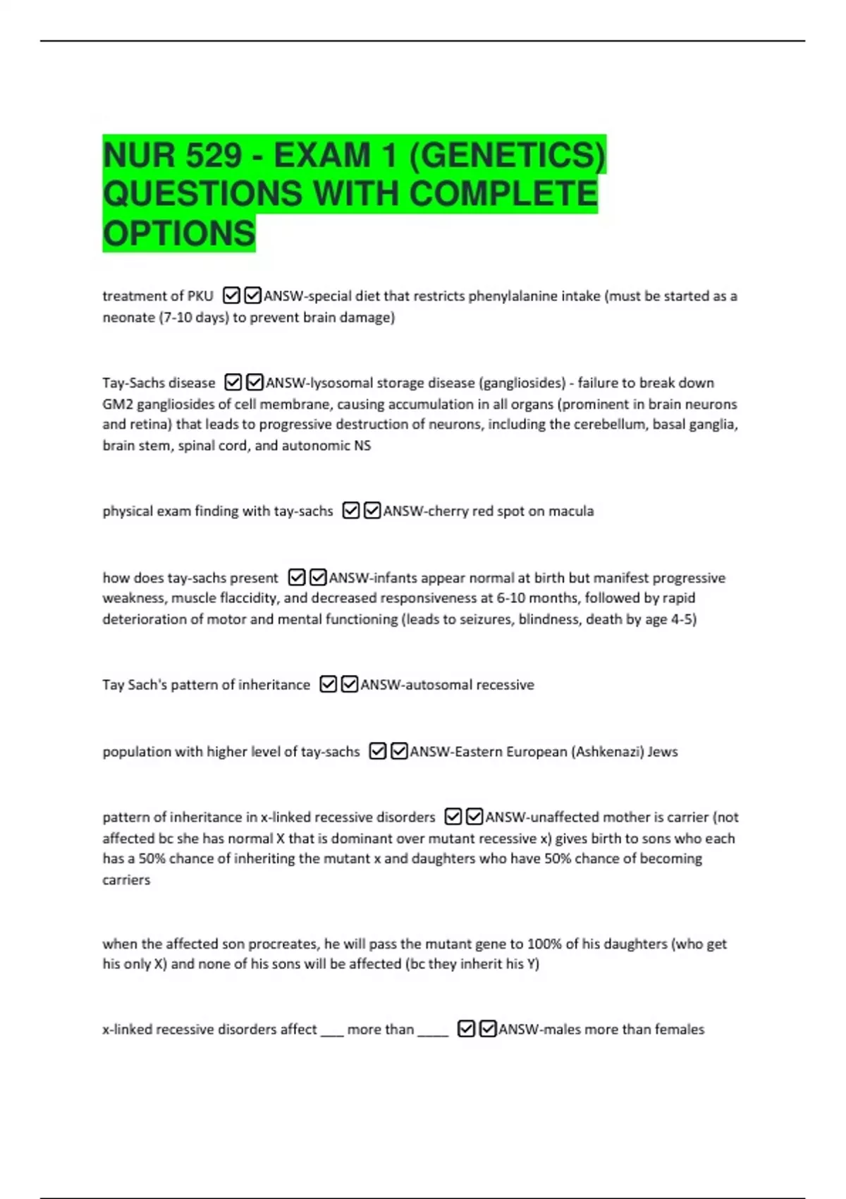 NUR 529 - EXAM 1 (GENETICS) QUESTIONS WITH COMPLETE OPTIONS treatment of PKU ANSW-special diet that restricts phenylalanine intake (must be started as a neonate (7-10 days) to prevent brain damage) Tay-Sachs disease ANSW-lysosomal storage disease (gangliosides) - failure to break down GM2 gangliosides of cell membrane, causing accumulation in all organs (prominent in brain neurons and retina) that leads to progressive destruction of neurons, including the cerebellum, basal ganglia, brain stem, spinal cord, and autonomic NS physical exam finding with tay-sachs ANSW-cherry red spot on macula