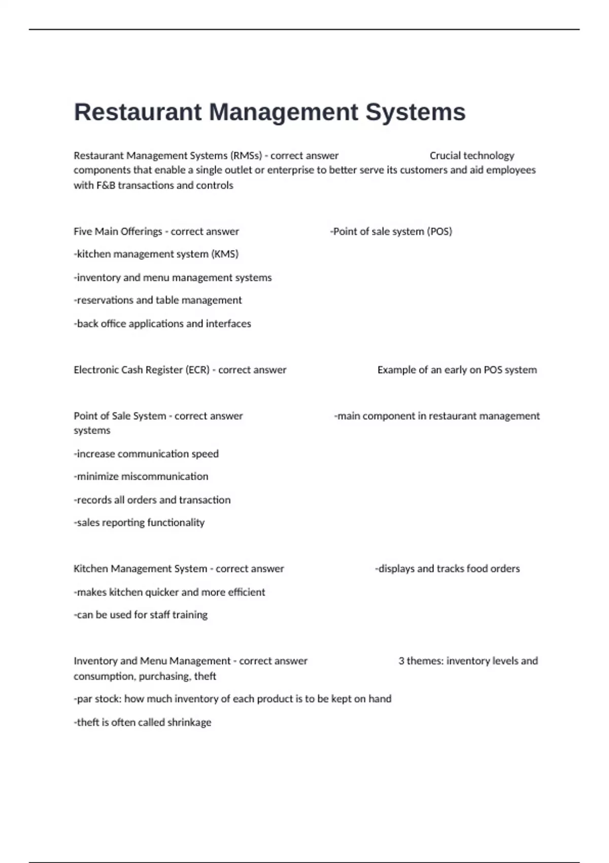 Point of Sale System - correct answer -main component in restaurant management