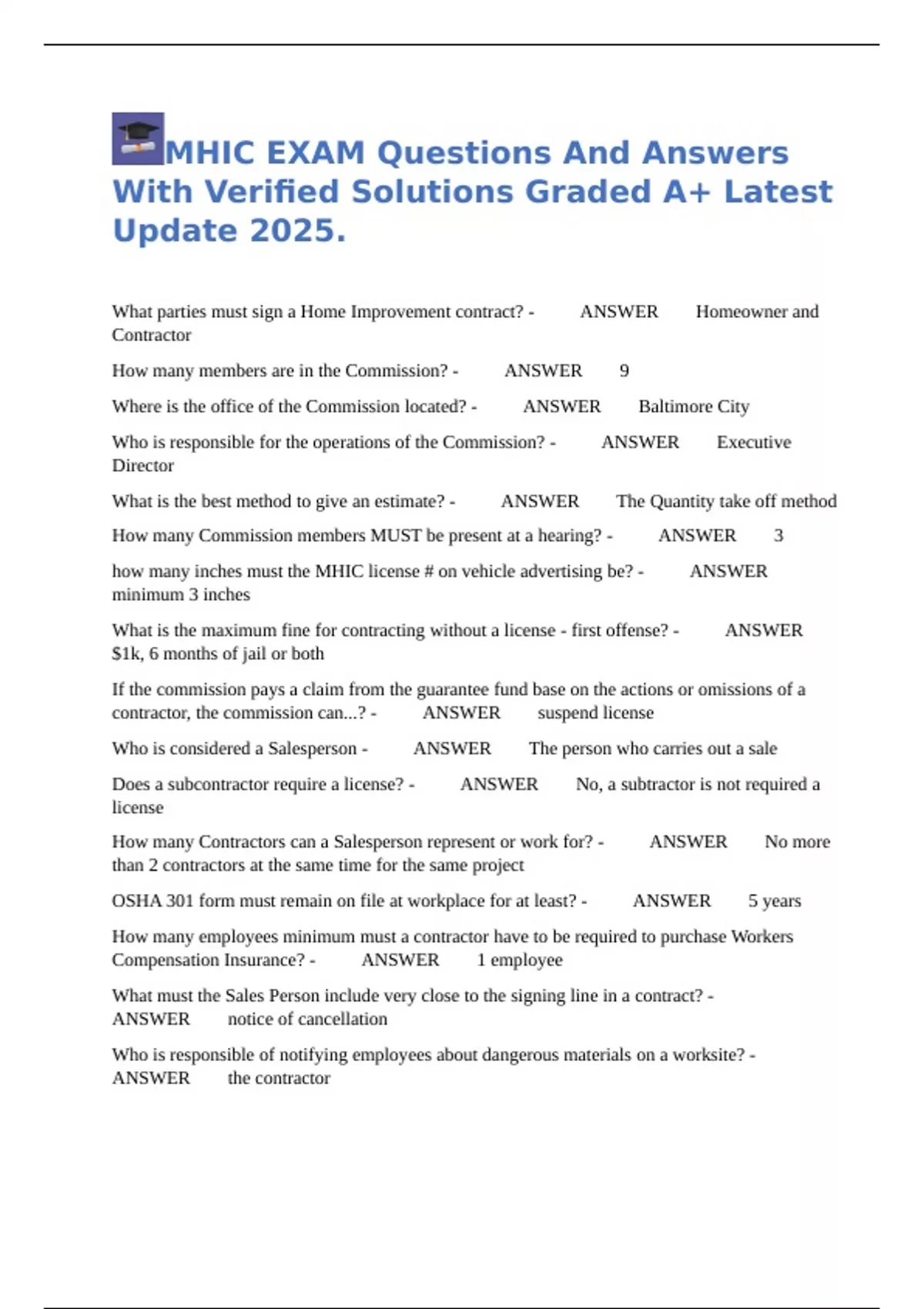 MHIC EXAM Questions And Answers