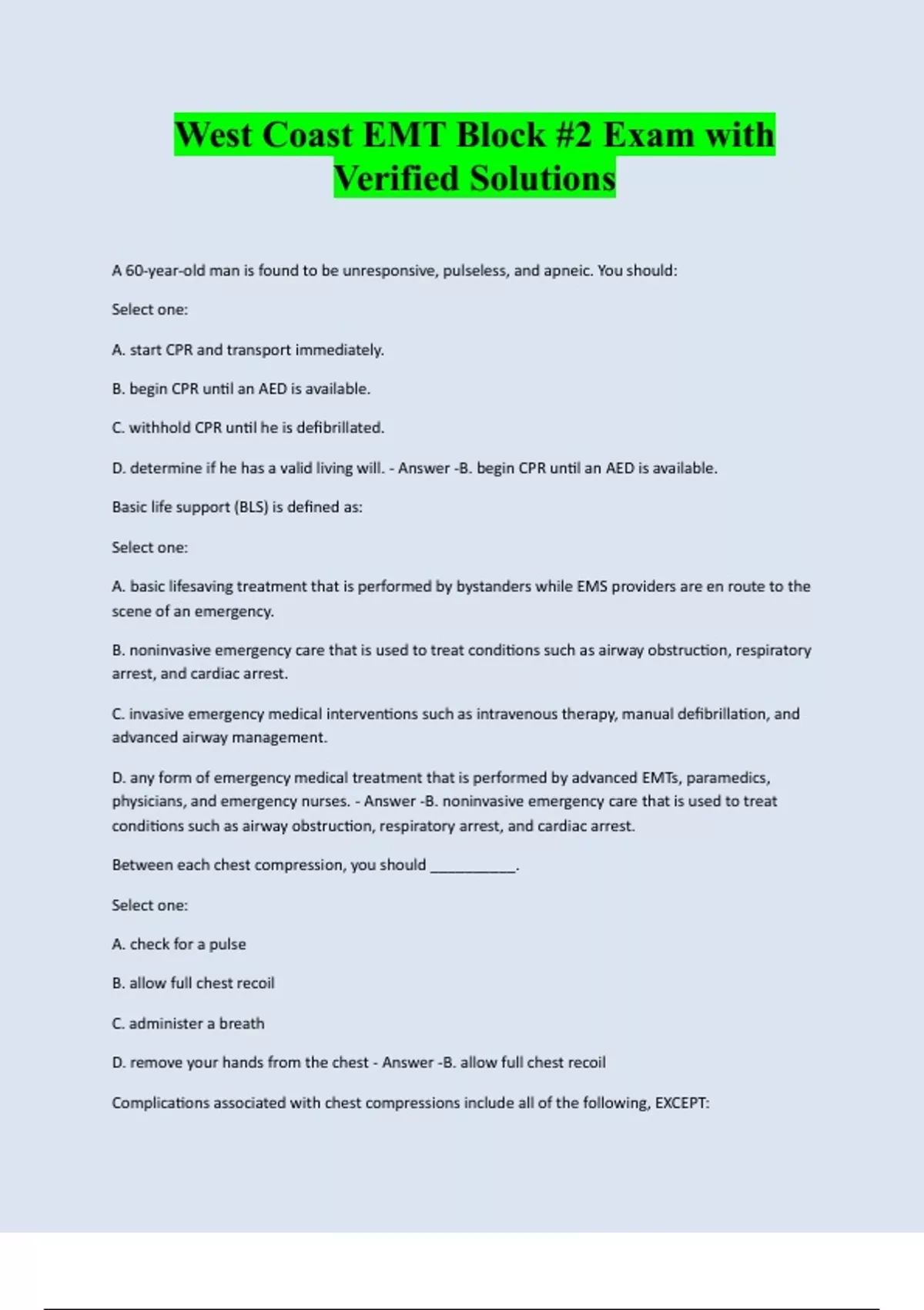 West Coast EMT Block #2 Exam with Verified Solutions A 60-year-old man is found to be unresponsive, pulseless, and apneic. You should: Select one: A. start CPR and transport immediately. B. begin CPR until an AED is available. C. withhold CPR until he is defibrillated. D. determine if he has a valid living will. - Answer -B. begin CPR until an AED is available. Basic life support (BLS) is defined as: Select one: A. basic lifesaving treatment that is performed by bystanders while EMS providers are en route to the scene of an emergency. B. noninvasive emergency care that is used to treat conditions such as airway obstruction, respiratory arrest, and cardiac arrest. C. invasive emergency medical interventions such as intravenous therapy, manual defibrillation, and advanced airway management. D. any form of emergency medical treatment that is performed by advanced EMTs, paramedics, physicians, and emergency nurses. - Answer -B. noninvasive emergency care that is used to treat conditions such as airway obstruction, respiratory arrest, and cardiac arrest. Between each chest compression, you should __________. Select one: A. check for a pulse B. allow full chest recoil C. administer a breath D. remove your hands from the chest - Answer -B. allow full chest recoil Complications associated with chest compressions include all of the following, EXCEPT:Select one: A. a fractured sternum. B. gastric distention. C. rib fractures. D. liver laceration. - Answer -B. gastric distention. CPR is in progress on a pregnant woman. Shortly after manually displacing her uterus to the left, return of spontaneous circulation occurs. Which of the following would MOST likely explain this? Select one: A. Displacement of her uterus caused blood to flow backward, which increased blood flow to her heart. B. Increased blood flow to her heart caused her ventricles to stop fibrillating, which restored her pulse. C. Displacement of her uterus allowed her lungs to expand more fully, which restored her pulse. D. Pressure was relieved from her aorta and vena cava, which improved chest compression effectiveness. - Answer -D. Pressure was relieved from her aorta and vena cava, which improved chest compression effectiveness. CPR retraining is the MOST effective when it: Select one: A. occurs every 24 months. B. is delivered by computer. C. involves hands-on practice. D. is self-paced and brief. - Answer -C. involves hands-on practice. CPR should be initiated when: Select one: A. rigor mortis is obvious. B. signs of putrefaction are present. C. the carotid pulse is very weak. D. a valid living will is unavailable. - Answer -D. a valid living will is unavailable. CPR will NOT be effective if the patient is:Select one: A. supine. B. prone. C. horizontal. D. on a firm surface. - Answer -B. prone. Gastric distention will MOST likely occur: Select one: a. when you deliver minimal tidal volume.