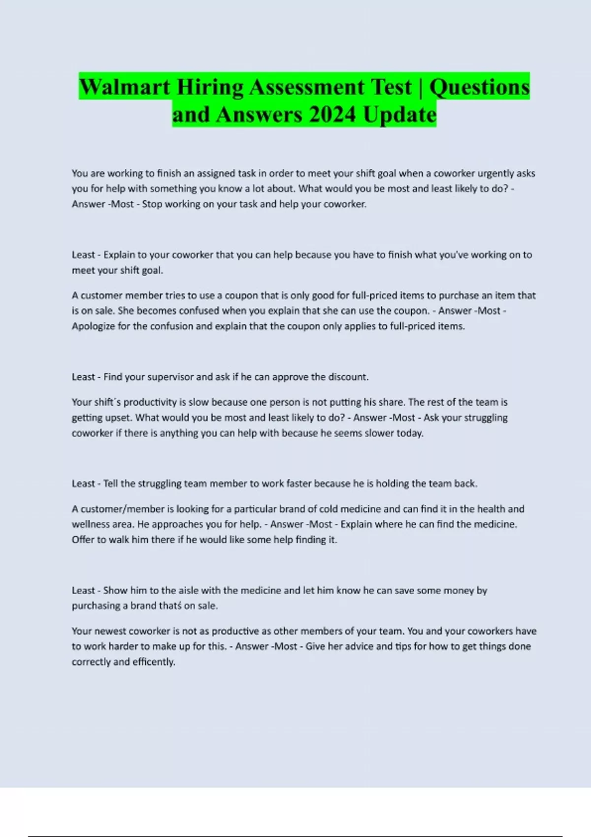 Walmart Hiring Assessment Test | Questions and Answers 2024 Update You are working to finish an assigned task in order to meet your shift goal when a coworker urgently asks you for help with something you know a lot about. What would you be most and least likely to do? - Answer -Most - Stop working on your task and help your coworker. Least - Explain to your coworker that you can help because you have to finish what you've working on to meet your shift goal. A customer member tries to use a coupon that is only good for full-priced items to purchase an item that is on sale. She becomes confused when you explain that she can use the coupon. - Answer -Most - Apologize for the confusion and explain that the coupon only applies to full-priced items. Least - Find your supervisor and ask if he can approve the discount. Your shift´s productivity is slow because one person is not putting his share. The rest of the team is getting upset. What would you be most and least likely to do? - Answer -Most - Ask your struggling coworker if there is anything you can help with because he seems slower today. Least - Tell the struggling team member to work faster because he is holding the team back. A customer/member is looking for a particular brand of cold medicine and can find it in the health and wellness area. He approaches you for help. - Answer -Most - Explain wh