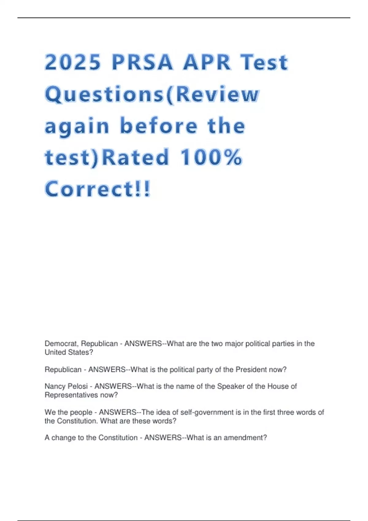 Democrat, Republican - ANSWERS--What are the two major political parties in the United States? Republican - ANSWERS--What is the political party of the President now? Nancy Pelosi - ANSWERS--What is the name of the Speaker of the House of Representatives now? We the people - ANSWERS--The idea of self-government is in the first three words of the Constitution. What are these words? A change to the Constitution - ANSWERS--What is an amendment?