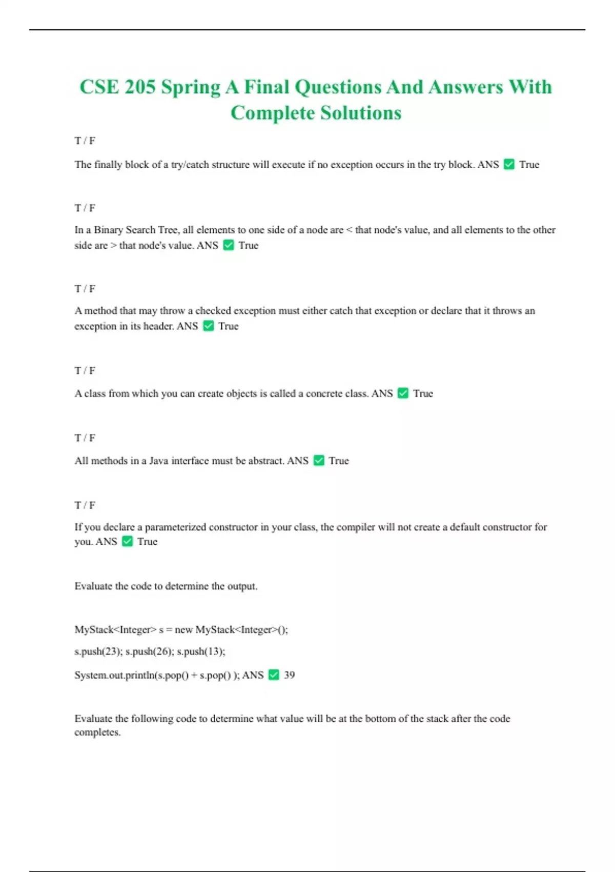 CSE 205 Spring A Final Questions And Answers With Complete Solutions T / F The finally block of a try/catch structure will execute if no exception occurs in the try block. ANS True T / F In a Binary Search Tree, all elements to one side of a node are < that node's value, and all elements to the other side are > that node's value. ANS True T / F A method that may throw a checked exception must either catch that exception or declare that it throws an exception in its header. ANS True T / F A class from which you can create objects is called a concrete class. ANS True T / F All methods in a Java interface must be abstract. ANS True T / F If you declare a parameterized constructor in your class, the compiler will not create a default constructor for you. ANS True Evaluate the code to determine the output. MyStack<Integer> s = new MyStack<Integer>(); (23); (26); (13); Sln(() + () ); ANS 39 Evaluate the following code to determine what value will be at the bottom of the stack after the code completes. MyStack<Integer> s = new MyStack<Integer>(); (16); (6