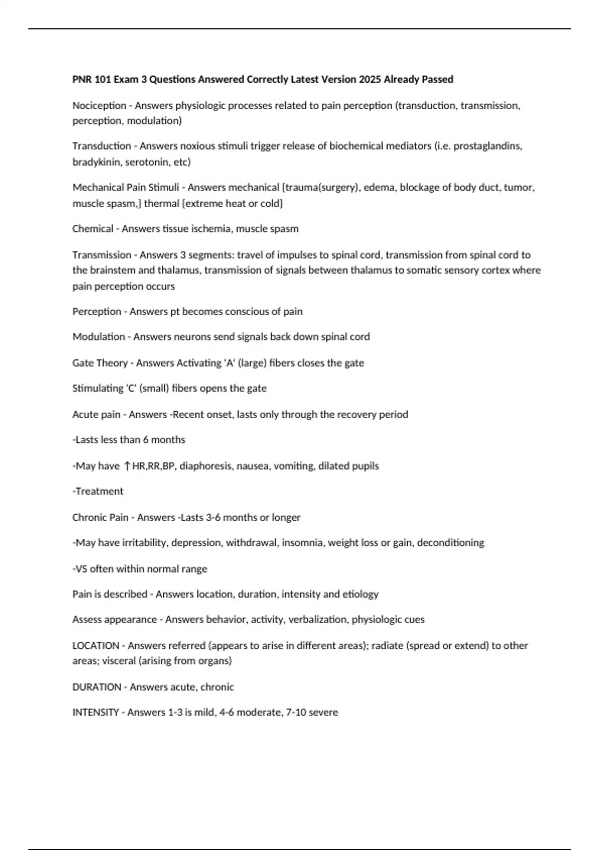 Chronic Pain - Answers -Lasts 3-6 months or longer