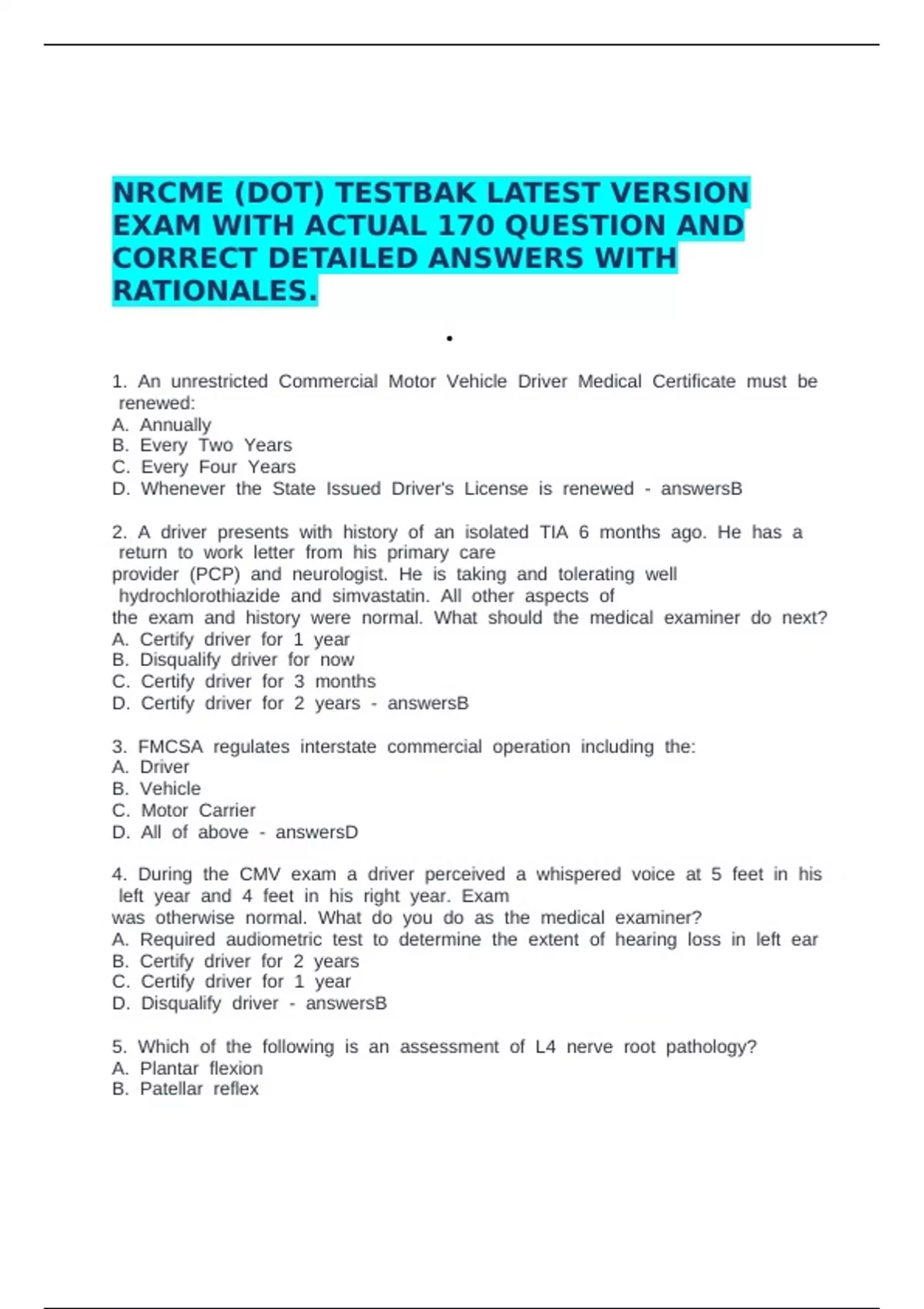 EXAM WITH ACTUAL 170 QUESTION AND