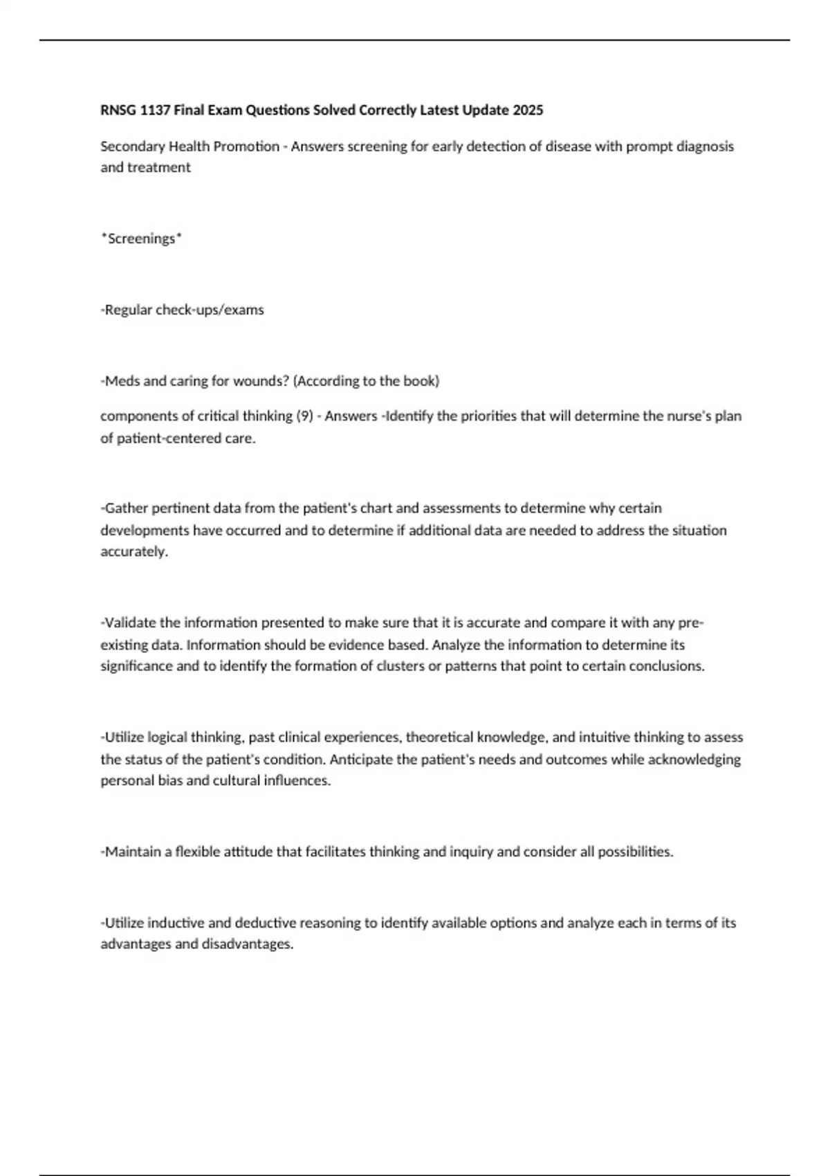 RNSG 1137 Final Exam Questions Solved Correctly Latest Update 2025 Secondary Health Promotion - Answers screening for early detection of disease with prompt diagnosis and treatment *Screenings* -Regular check-ups/exams -Meds and caring for wounds? (According to the book) components of critical thinking (9) - Answers -Identify the priorities that will determine the nurse's plan of patient-centered care. -Gather pertinent data from the patient's chart and assessments to determine why certain developments have occurred and to determine if additional data are needed to address the situation accurately. -Validate the information presented to make sure that it is accurate and compare it with any pre-existing data. Information should be evidence based. Analyze the information to determine its significance and to identify the formation of clusters or patterns that point to certain conclusions. -Utilize logical thinking, past clinical experiences, theoretical knowledge, and intuitive thinking to assess the status of the patient's condition. Anticipate the patient's needs and outcomes while acknowledging personal bias and cultural influences. -Maintain a flexible attitude that facilitates thinking and inquiry and consider all possibilities. -Utilize inductive and deductive reasoning to identify available options and analyze each in terms of its advantages and disadvantages. -Formulate decisions that reflect creativity and independent decision making. -Demonstrate personal humility in terms of one's knowledge deficits and willingly seek additional information to assist with decision making. -Exhibit the courage to seek new, innovative approaches to patient-centered care. Detach their personal viewpoints from situations and look at things objectively, a process called bracketing. Common Areas Requiring Advocacy (17) - Answers 1. End-of-life decisions 2. Technological advances 3. Health-care reimbursement 4. Access to health care 5. Transitions in health care 6. Provider-patient conflicts regarding expectations and desired outcomes 7. Withholding of information or blatant lying to patients 8. Insurance authorizations, denials, and delays in coverage 9. Medical errors 10. Patient information disclosure (privacy and confidentiality) 11. Patient grievance and appeals processes